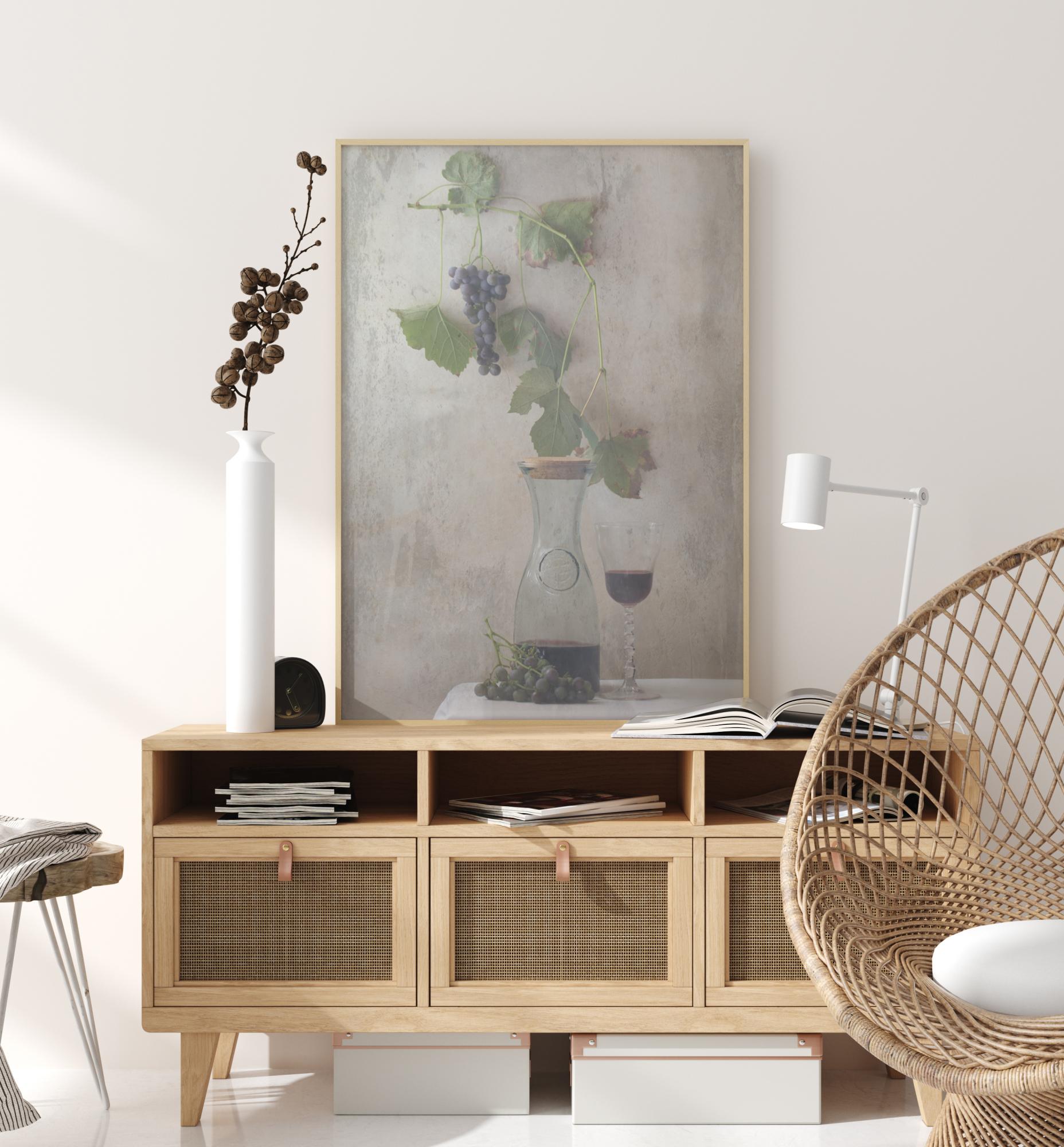 Plakat sa mrtvom prirodom s vrčem domaćeg vina, čašom za vino i malom grančicom s grožđem. Tamnoljubičasto grožđe i zeleni listovi nalaze se na jednostavnoj sivoj stijeni što ih čini istaknutima. Prenesite se u rimsku vilu kada imate ovaj elegantan ali jednostavan rad obješen kod kuće.