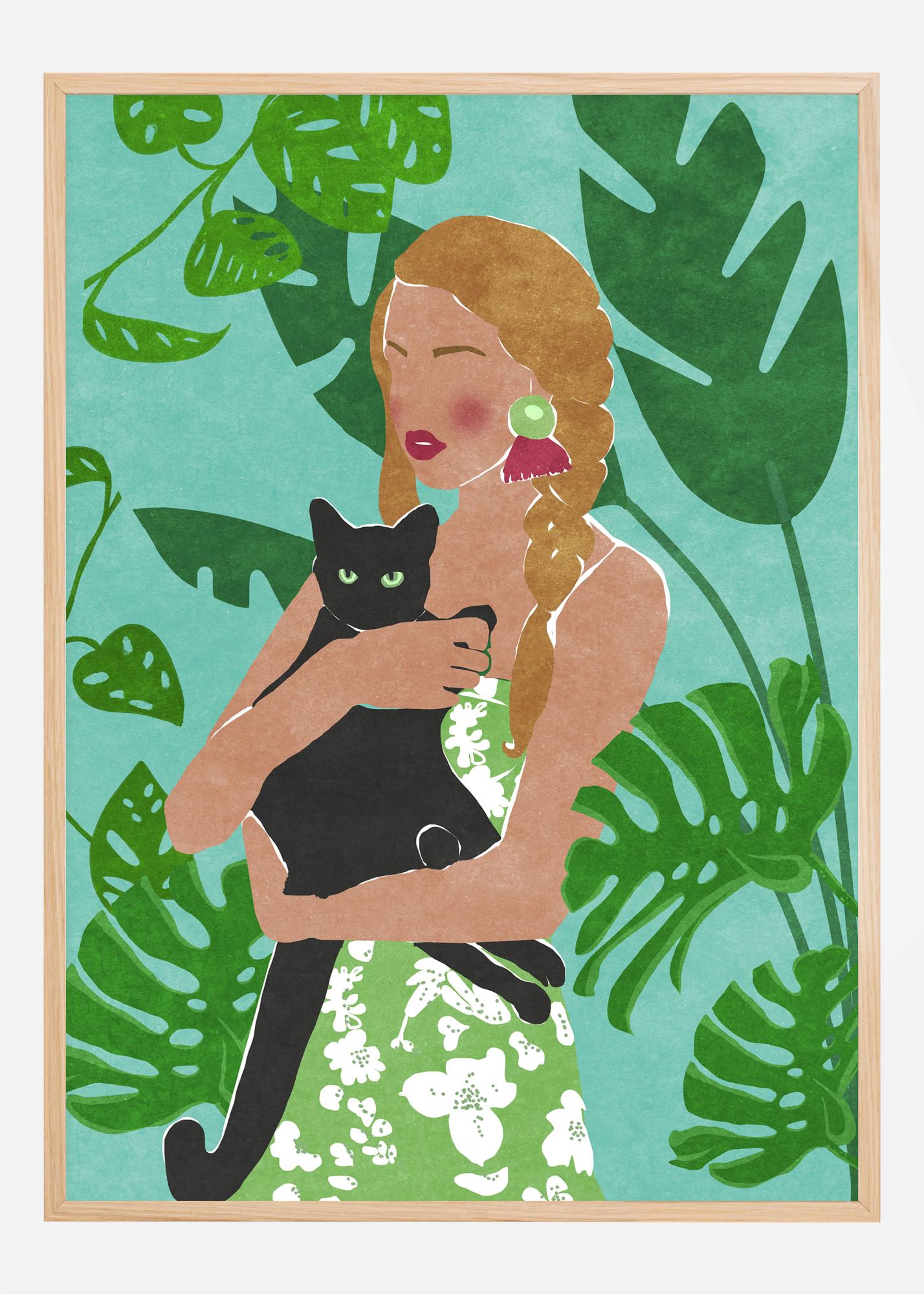 Na posteru dominiraju mirni i zemljani tonovi. Zelene nijanse biljaka i pozadine nude miran kontrast prema bež i smeđim tonovima žene, i dubokoj crnoj boji mačke. Detalji na bijeloj haljini s cvjetnim motivima dodaju lakoću kompoziciji. Poster je okružen drvenim okvirom (nije uključen u motiv) koji dodatno pojačava prirodan osjećaj. Ovo je print koji nije samo lijep detalj u uređenju, već i izraz ljubavi prema životinjama i oda jednostavnim radostima života.