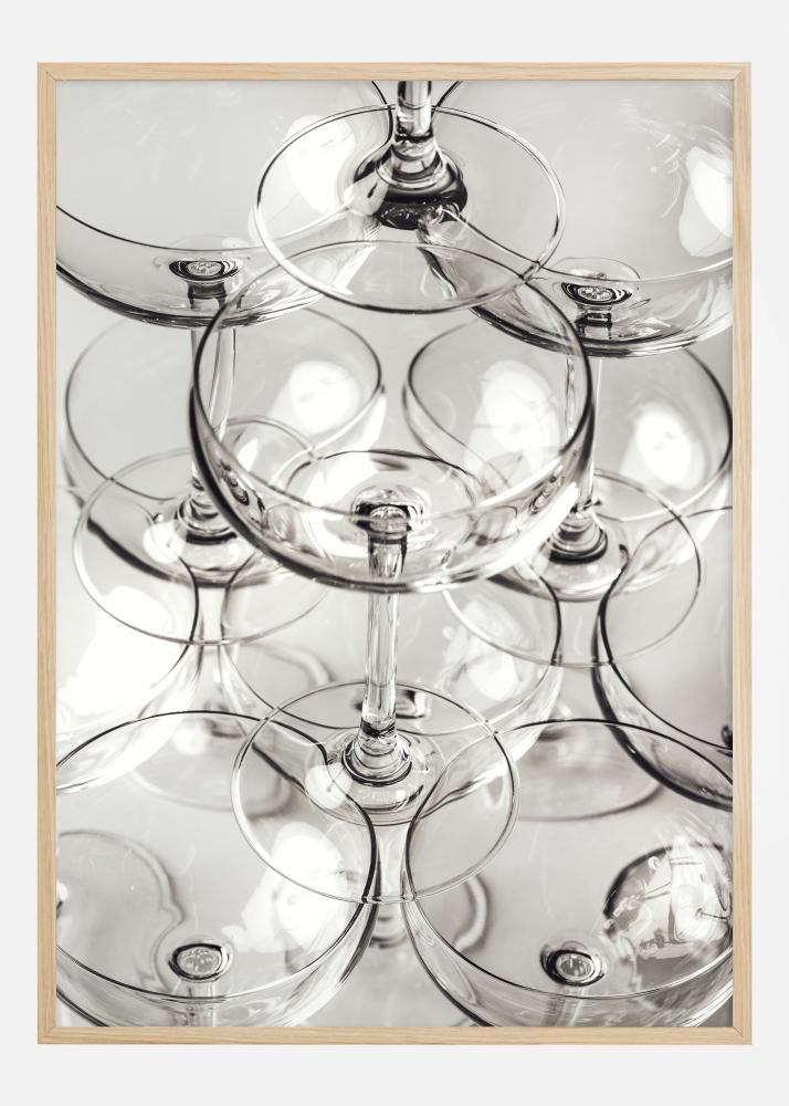 Ovaj elegantni i sofisticirani poster hvata ljepotu i jasnoću kaskade čaša za šampanjac. Slika prikazuje detaljan prikaz strukture stakla, gdje se svjetlo reflektira i lomi kroz prozirni materijal, stvarajući ples svjetlosti i sjena. Bogatstvo detalja i preciznost kompozicije ističu delikatne oblike čaša i suptilne nijanse stakla.