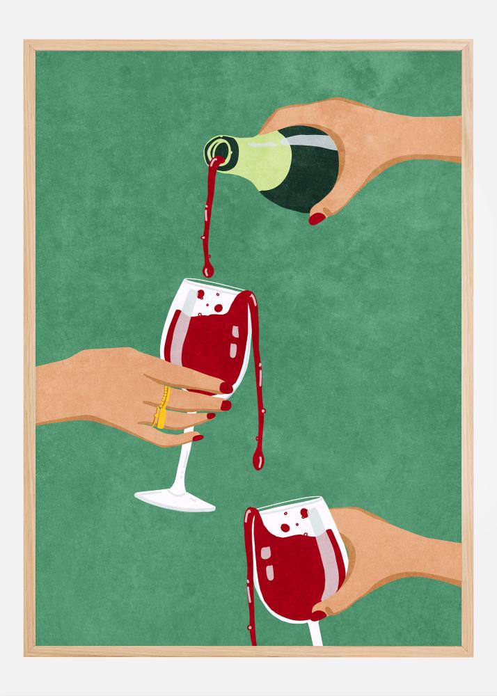 Ovaj razigrani i sofisticirani poster hvata esenciju prijateljstva i proslave. Ilustracija prikazuje tri ruke koje elegantno drže čaše za vino i bocu, gdje se tok crnog vina upravo ulijeva u jednu od čaša. Ova scena je omaž malim trenucima koji život čine posebnim i idealan je izbor za one koji žele dodati osjećaj zajedništva i svečanosti svom domu. Print je jednako dobar kao pokretač razgovora koliko i dekorativni element interijera.