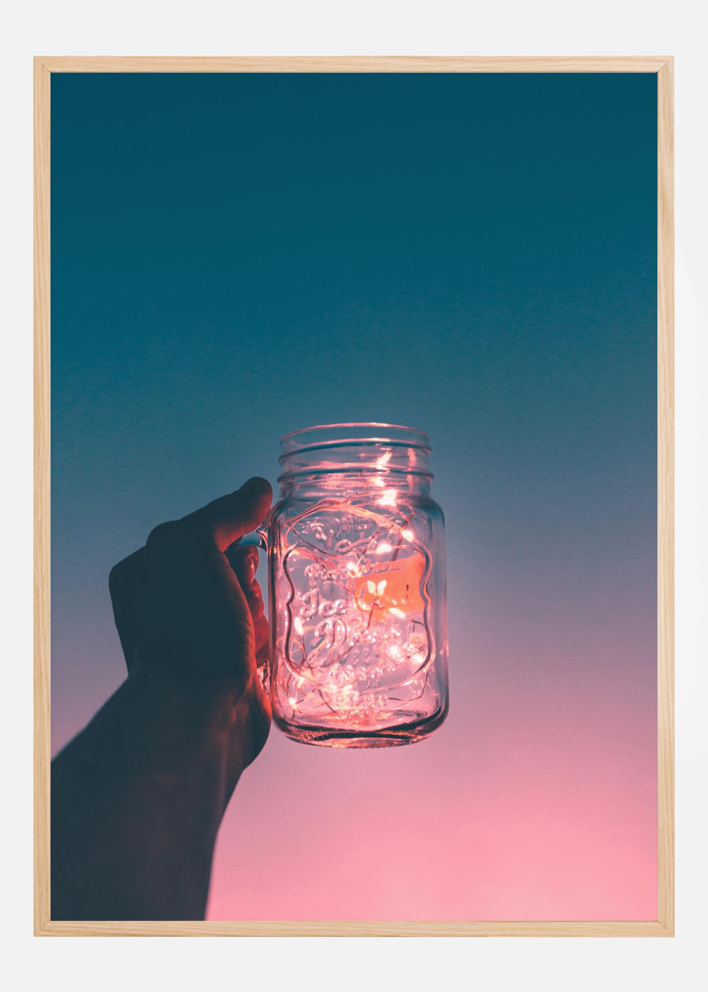 Ugodan poster s rukom koja drži staklenu šalicu s LED svjetlom. Uživajte u magičnoj atmosferi meke plave i ružičaste pozadine, koja djelu daje pravi osjećaj fantazije. Podignite svoju čašu prema ovoj slici i osjetite uzdižući osjećaj koji ovaj poster pruža.