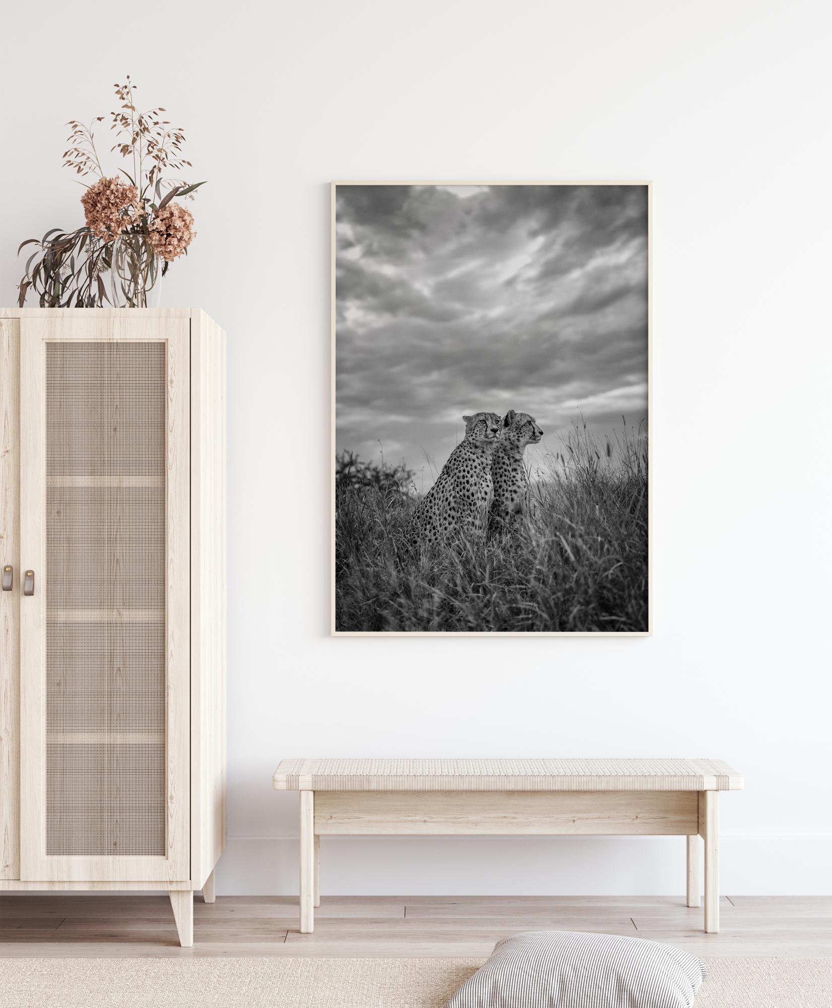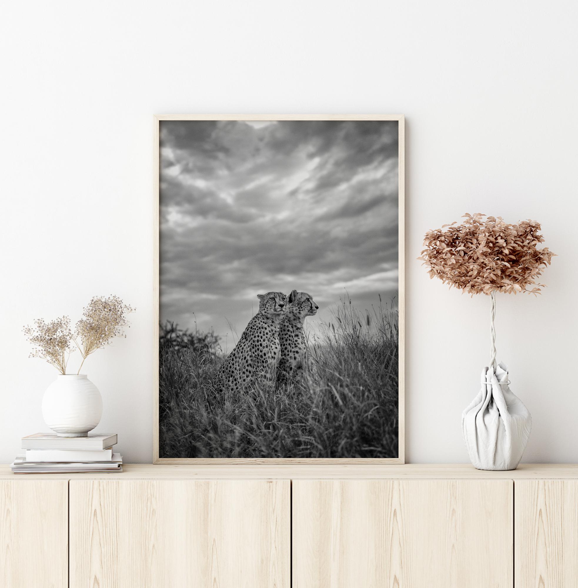 Prirodni poster s dva geparda koji gledaju preko afričkih ravnica. Oblacno nebo u kontrastu je s fantastičnim pjegama na tim životinjama. S ovim posterom možete ponijeti veličanstvenost prirode kući.