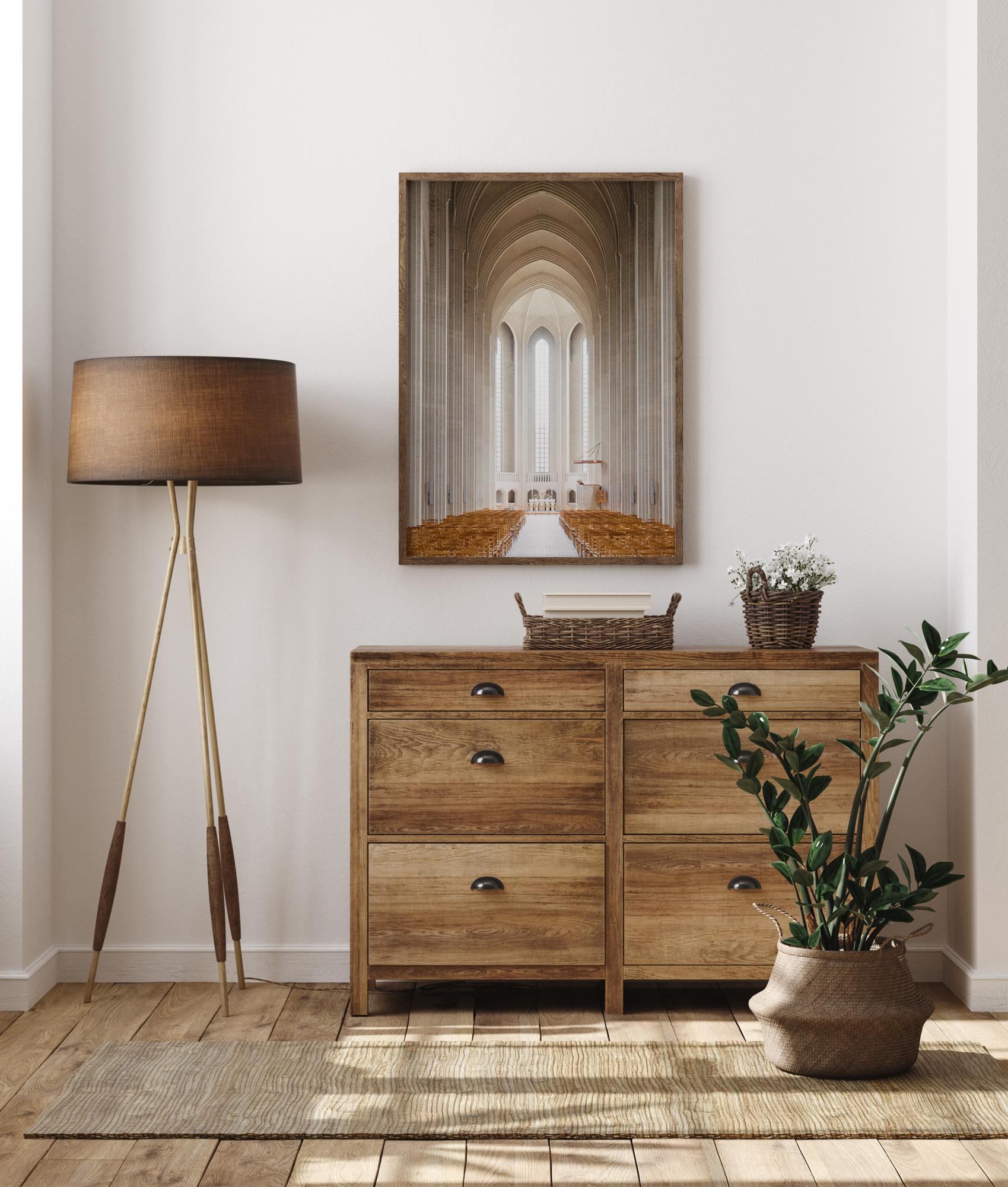 Romantični poster interijera crkve. Svijetlosmeđe stolice obrubljuju prolaz u dugim redovima sa svake strane. Gotčke lučne konstrukcije uokviruju djelo, usmjeravajući pogled prema svijetloj bijeloj svjetlosti na kraju crkvenog prolaza. Idite u crkvu od kuće kada imate ovaj religiozni poster koji visi kod kuće.