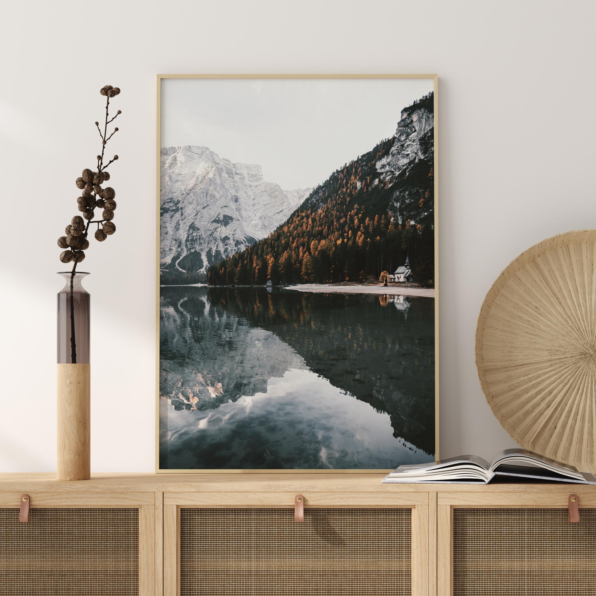 Epski poster planinskog prizora s malom crkvom smještenom u šumi. Uživajte u veličanstvenosti ovog snježnog krajolika gdje se planine odražavaju u mirnom jezeru. Jesensko žuto drveće obrubljuje planine, a mala bijela crkva stoji u podnožju. Inspirirajte se gledajući čuda prirode.