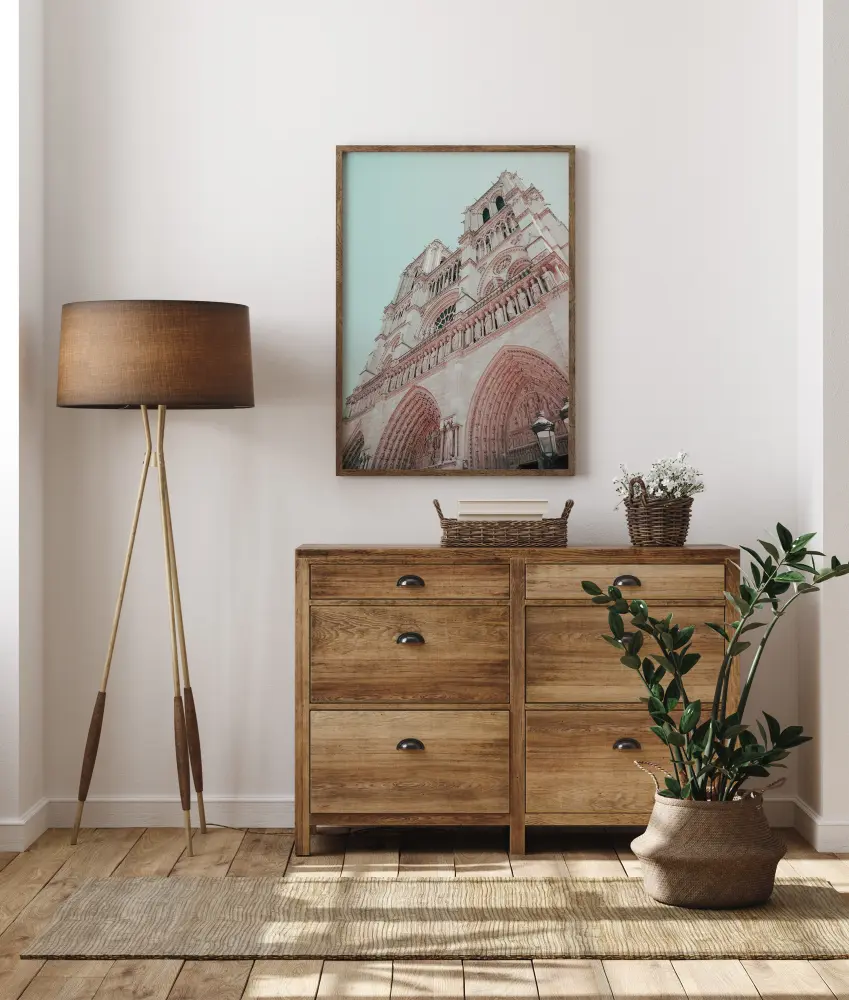 Dramatičan poster fasade crkve. Pogledajte prema gore duž ove bijele i ružičaste zgrade s njezinim gotičkim lukovima, kamenim kipovima i okruglim prozorima. Mekani pastelni tonovi stvaraju harmoničan dojam, savršen način za stvaranje umirujuće atmosfere kod kuće.