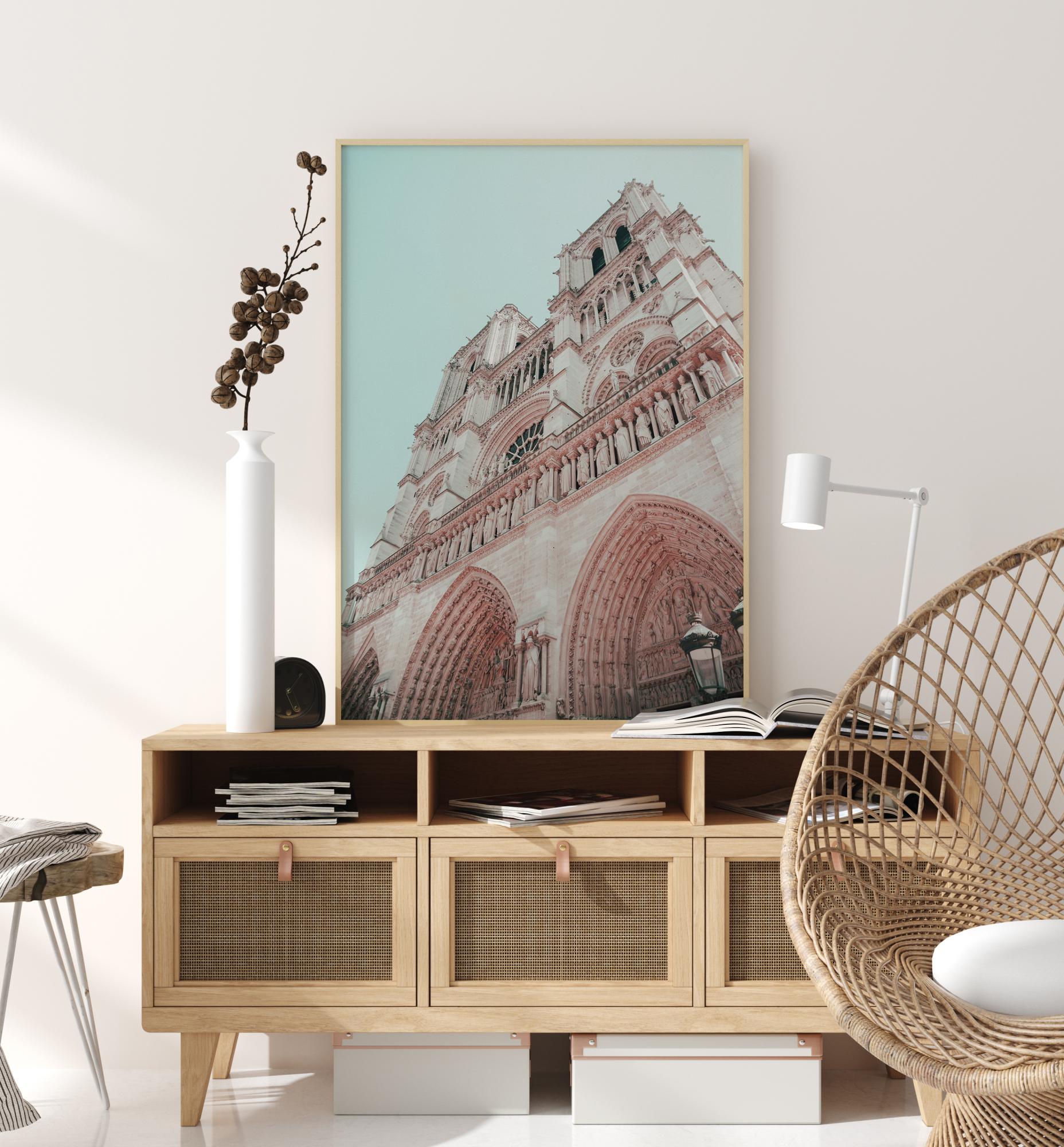 Dramačična poster crkvene fasade. Pogledajte prema gore uz ovu bijelu i ružičastu zgradu s gotičkim lukovima, kamenim kipovima i okruglim prozorima. Meke pastelne boje stvaraju harmoničan osjećaj, savršen način za stvaranje umirujuće atmosfere kod kuće.
