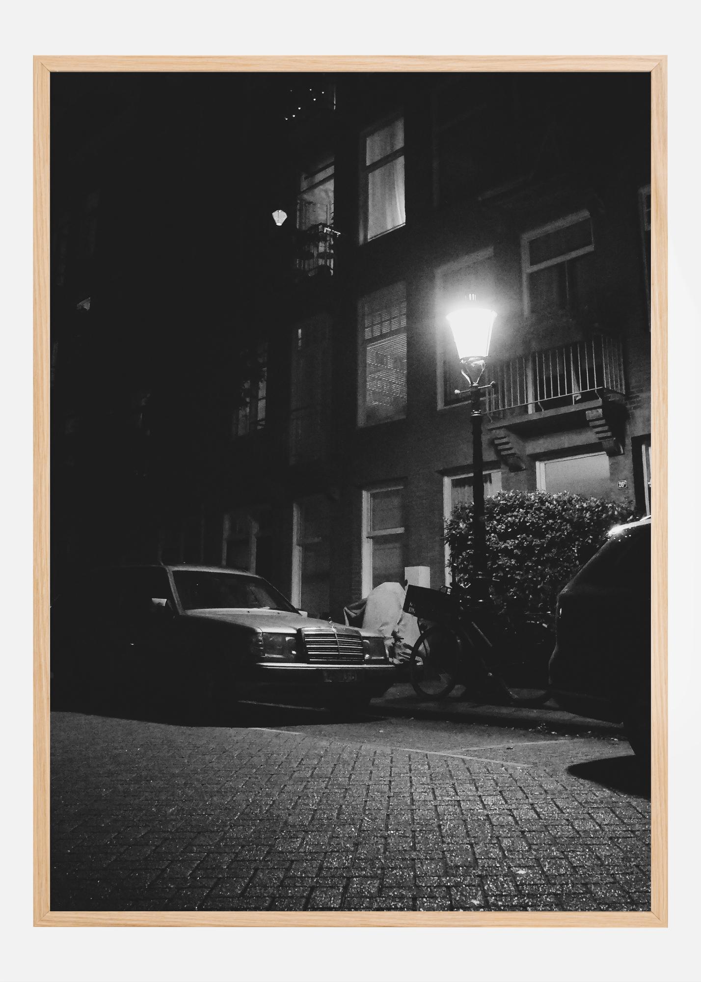 Ovaj fascinantni poster pruža uvid u gradski život kada padne noć. Usamljena ulična svjetiljka kupa pločnik i parkirane automobile u mekom, toplom svjetlu. Motiv je uhvaćen u monokromatskoj paleti koja pojačava kontraste i detalje u ovoj mirnoj gradskoj slici. Ova slika je savršena za unos osjećaja smirenosti i promišljenosti u bilo koju prostoriju, podsjećajući na mirne trenutke u inače užurbanom ritmu grada.