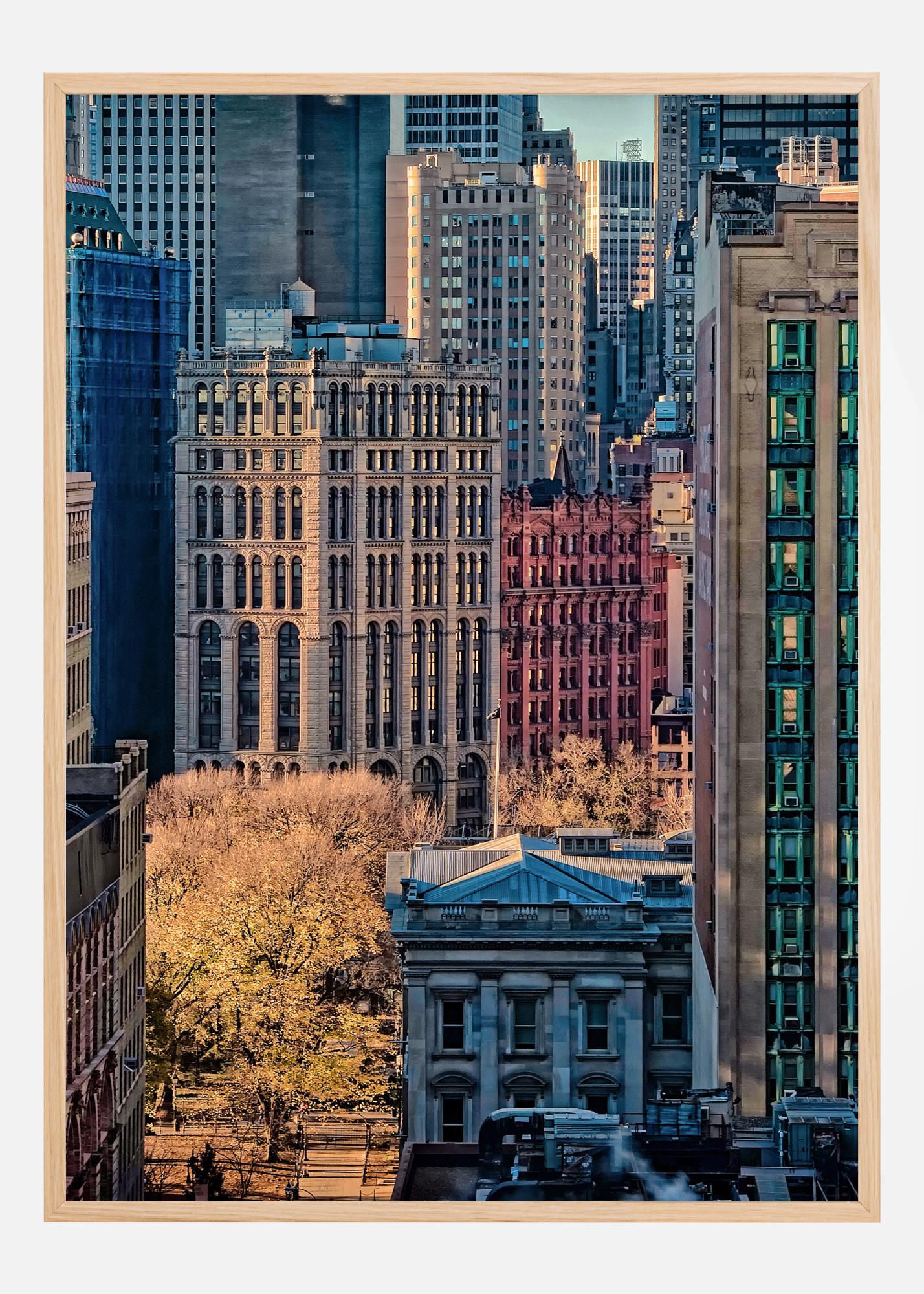 Urban plakat s krajolikom s starim i novim zgradama. Jesenja stabla i crvene ciglene zgrade sjajno kontrastiraju hladnijim plavim neboderima. Zamislite da gledate kroz svoj prozor na ovo zauzeto gradsko mjesto dok imate ovu sliku u svom domu.