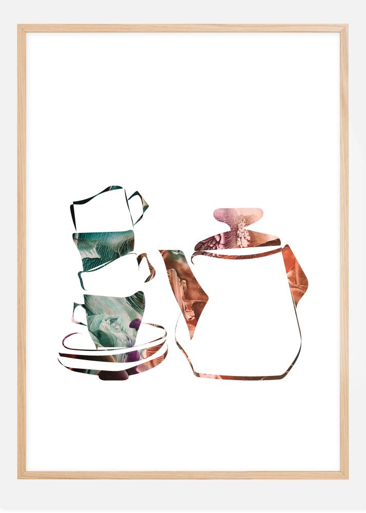 Apstraktni poster s kavom i čajem te šalicama, tanjurima i vrčem. Svaki je napravljen od apstraktnih mramoriranih polja u tirkiznoj i narančastoj boji na bijeloj pozadini. Pripremite se za svoj omiljeni među toplim napicima dok svakog jutra gledate ovu sliku.