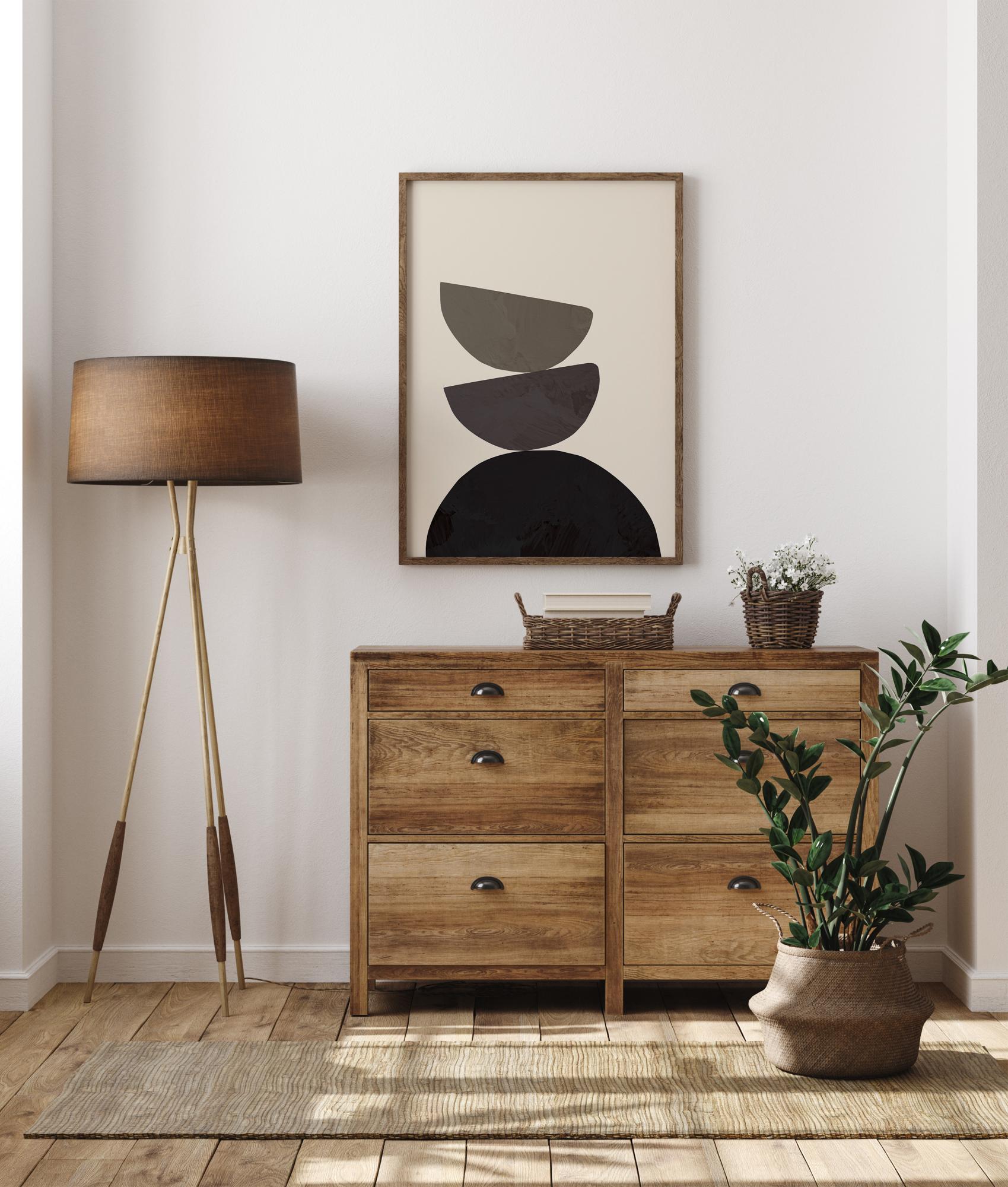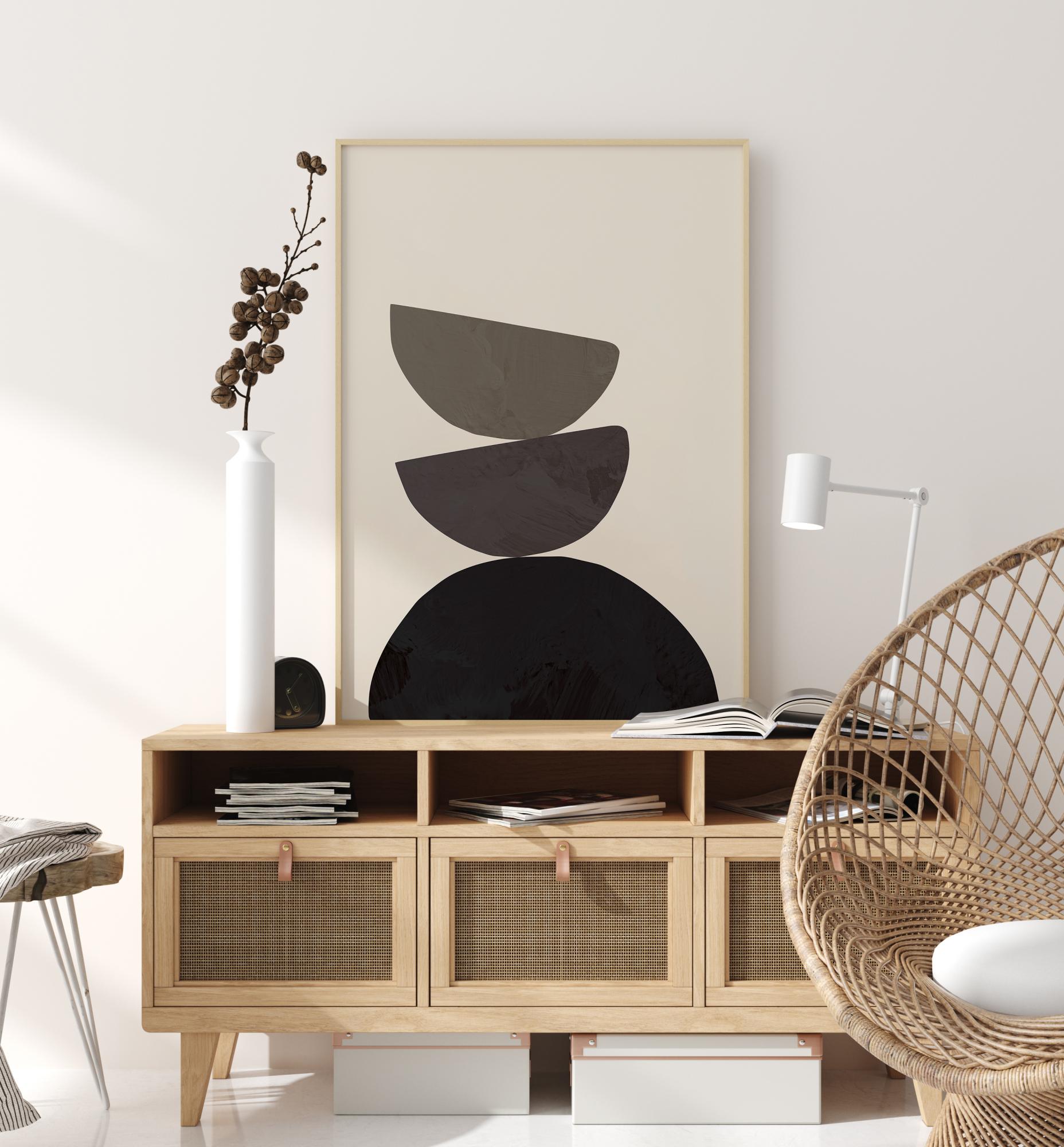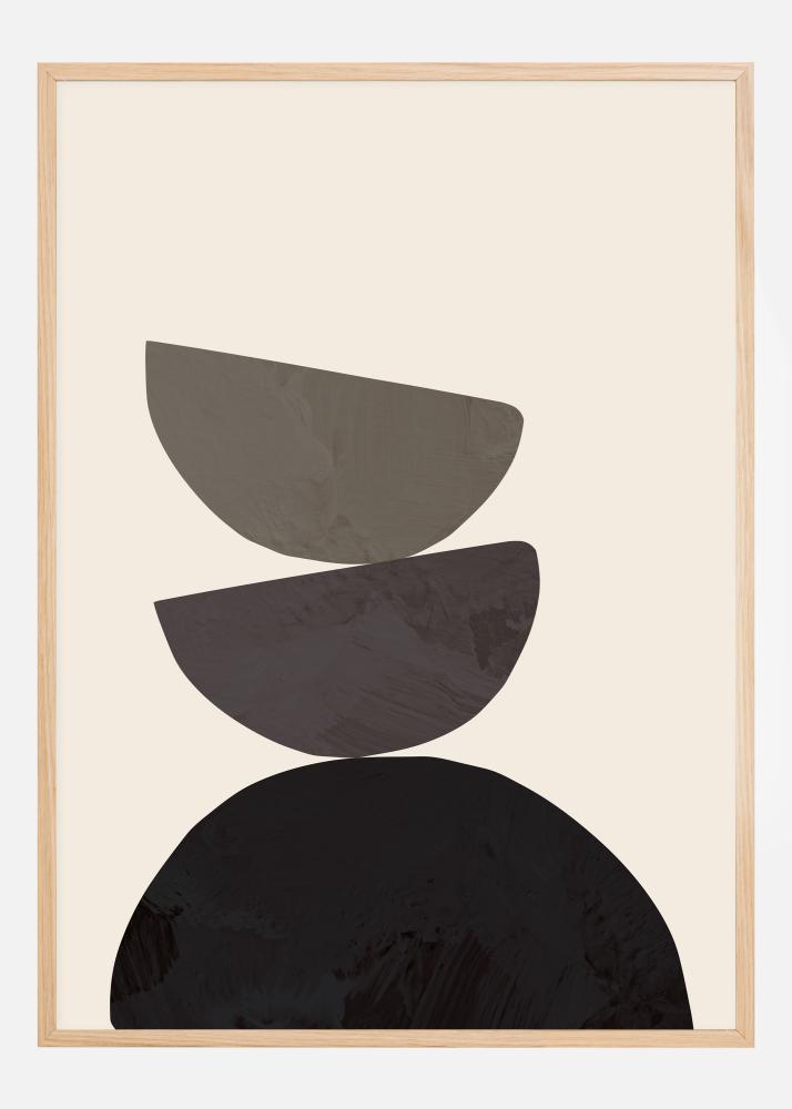 Poster s tri složene polukružnice koje balansiraju jedna na drugoj. Na dnu je crna polukružnica s dvije polukružnice okrenute prema gore u različitim sivim tonovima. Uživajte u nevjerojatno uravnoteženim oblicima kada objesite ovu sliku na svijetlo obojeni zid.