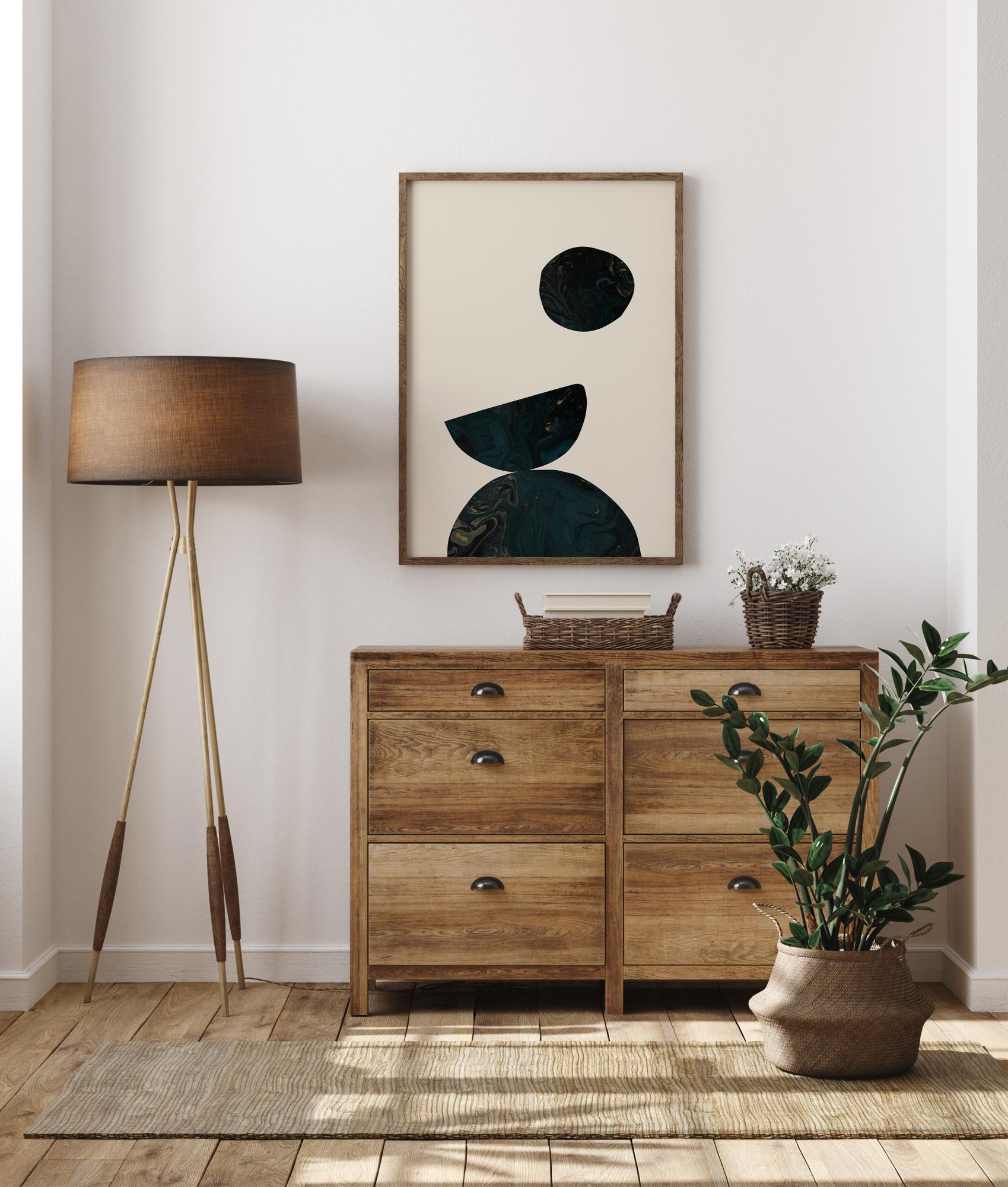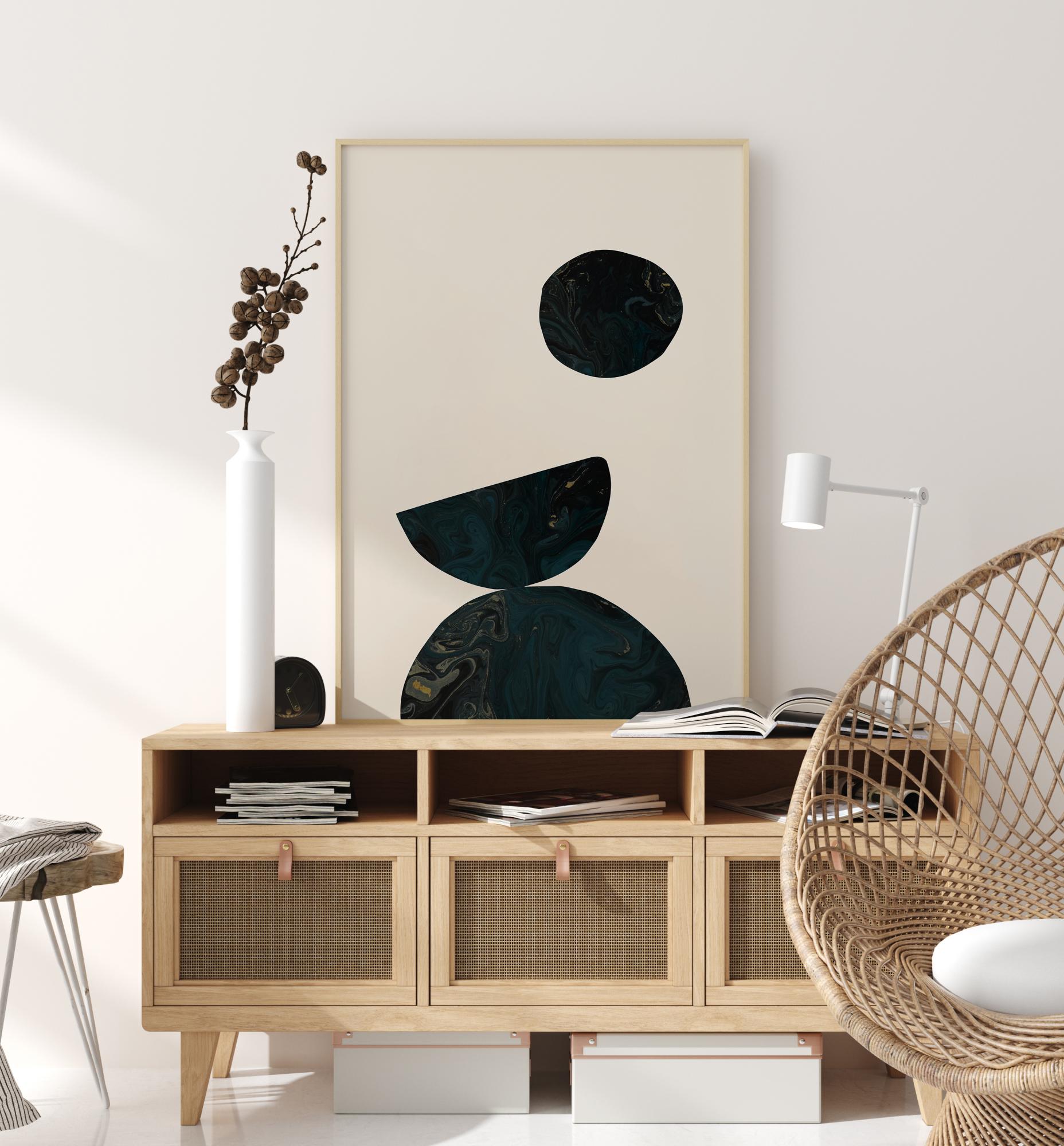 Svijetli poster s tri tamnoplava i crna oblika koji stvaraju upečatljivu sliku. Polukrug je postavljen na dno i balansira s drugim, obrnuto postavljenim polukrugom. Iznad lebdi crni krug. Sve je na kontrastnoj bijeloj pozadini. Uskladite prekrasne mramorne kovitlace s blijedom bojom na zidovima za dodatnu dramatiku.