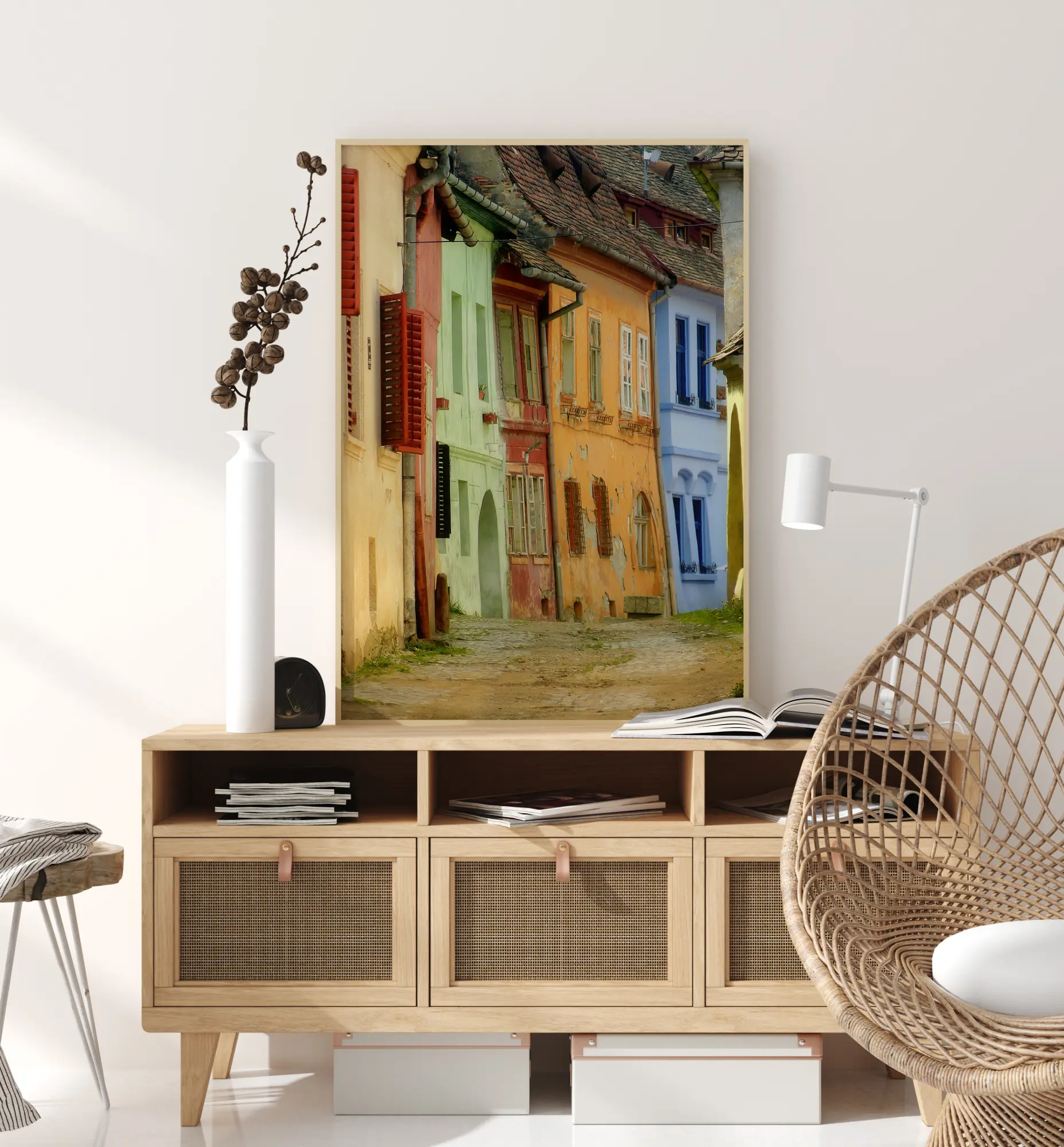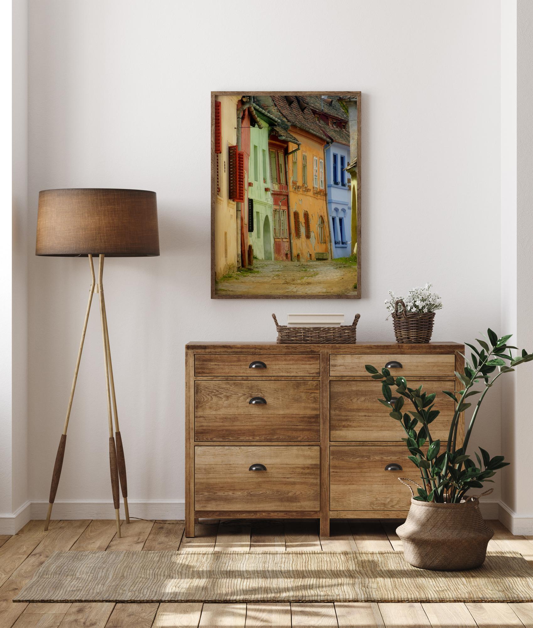 Pitoreskni poster sa starim, ali šarenim kućama duž uske ulice. Kaldrmisana ulica vodi između kuća bež, zelene, narančaste i plave boje s krovovima od cigle te širokim otvorenim crvenim kapcima na prozorima. Uživajte u pitoresknoj, mirnoj atmosferi u ovoj šarmantnoj pitoresknoj sceni.