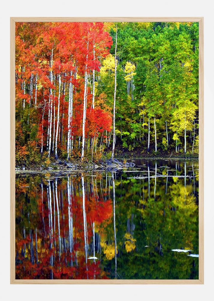 Svijetli poster s jezerom okruženim drvećem. Proljeće i jesen susreću se na ovoj šarenoj slici s crvenim lišćem s lijeve strane i zelenom s desne. Svi ostavljaju svijetle refleksije na vodi jezera u mirnom, ali ipak šarenom prizoru. Unesite radost prirode u svoj dom uz pomoć ovog ispisa.