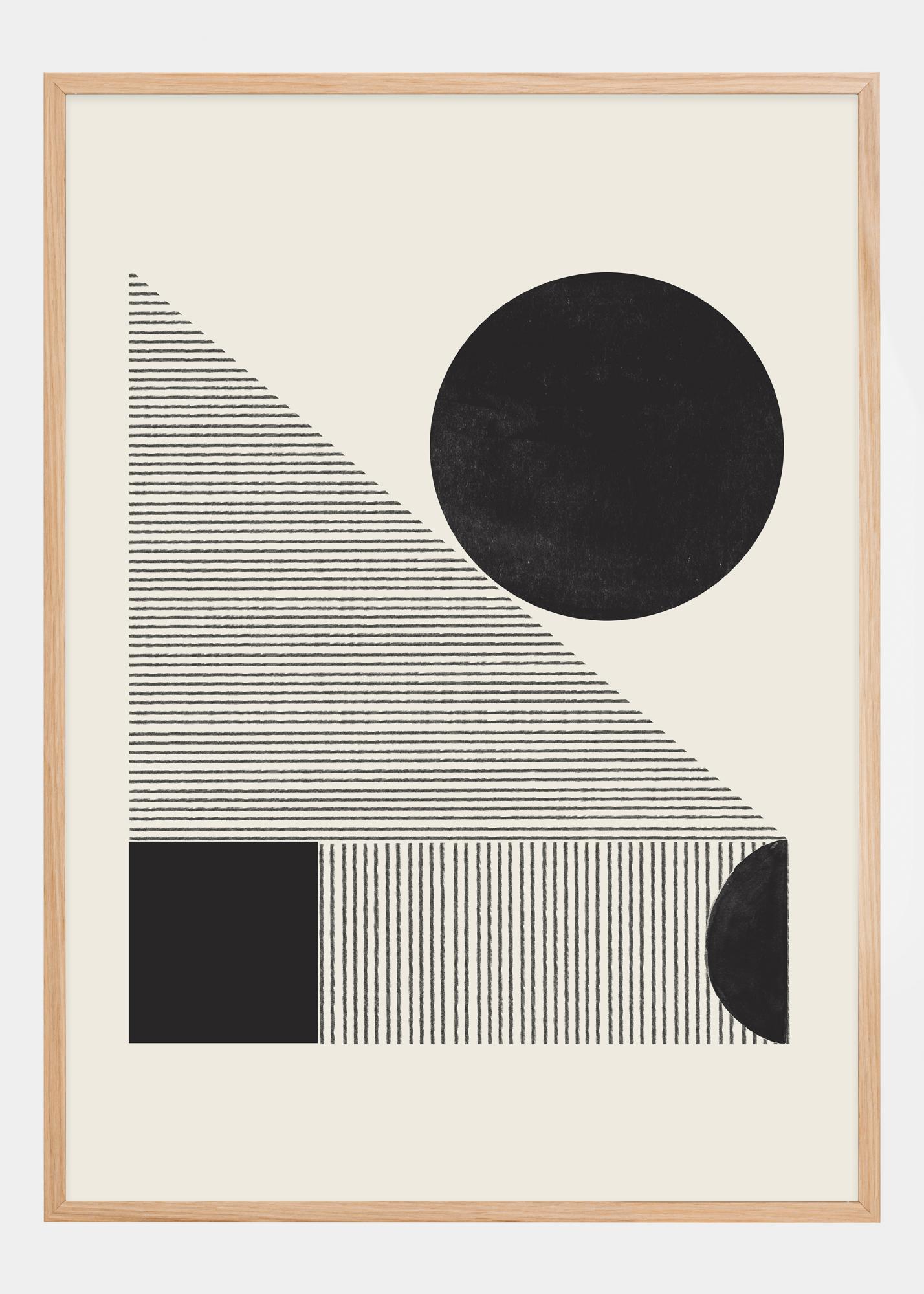 Ovaj poster je razigrana i sofisticirana interpretacija geometrijske apstrakcije. Crne i bijele linije meÄusobno se isprepliÄu u pažljivo balansiranom uzorku oblika, dok velika crna kružnica dominira gornjim dijelom kompozicije, stvarajuÄi snažnu vizualnu sidriÅ¡nu toÄku. Kontrastna igra izmeÄu punih crnih podruÄja i bijelih linija poziva promatraÄa na istraživanje razliÄitih tekstura i dubina u slici.