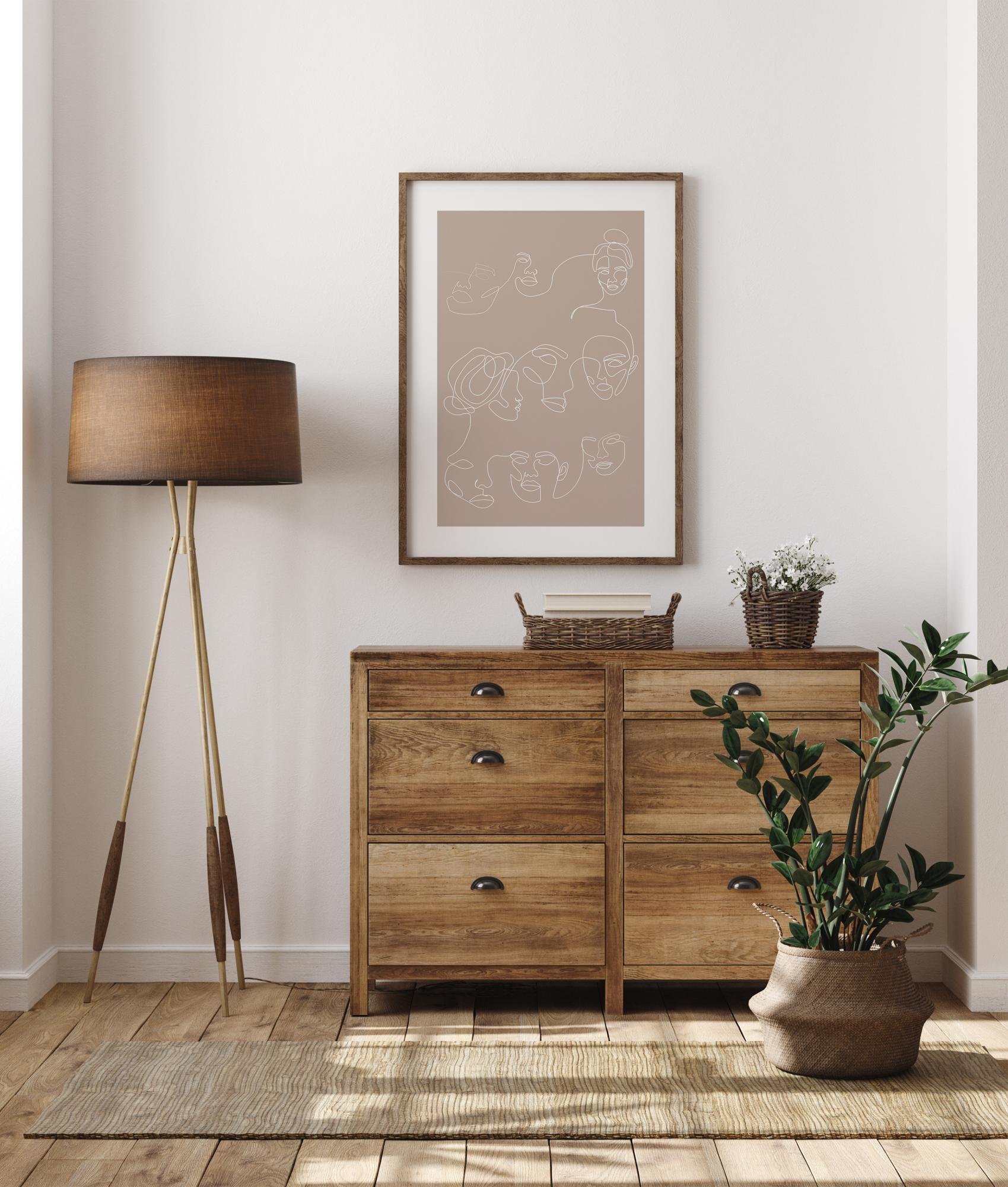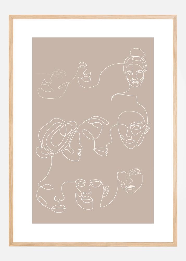 Plakat za skiciranje s nekoliko različitih apstraktno nacrtanih glava i lica. Ove apstraktne glave sve su nacrtane s jednom jedinom linijom i povezane su u dugi niz. Bijele linije na bež pozadini dobro bi funkcionirale s nekim zidom hrabre boje za dodatnu umjetničku atmosferu.