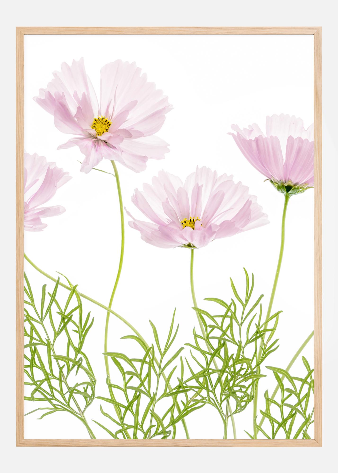 Poster u stilu ispisa s kozmičkim cvjetovima. Svaki cvijet je nježno ljubičasto-ružičasti sa svijetlo žutim središtem. Jednostavni zeleni listovi vode pogled prema ovim plešućim cvjetovima. Postignite razigrani osjećaj uz pomoć ovog fantastičnog ispisa u vašem domu.