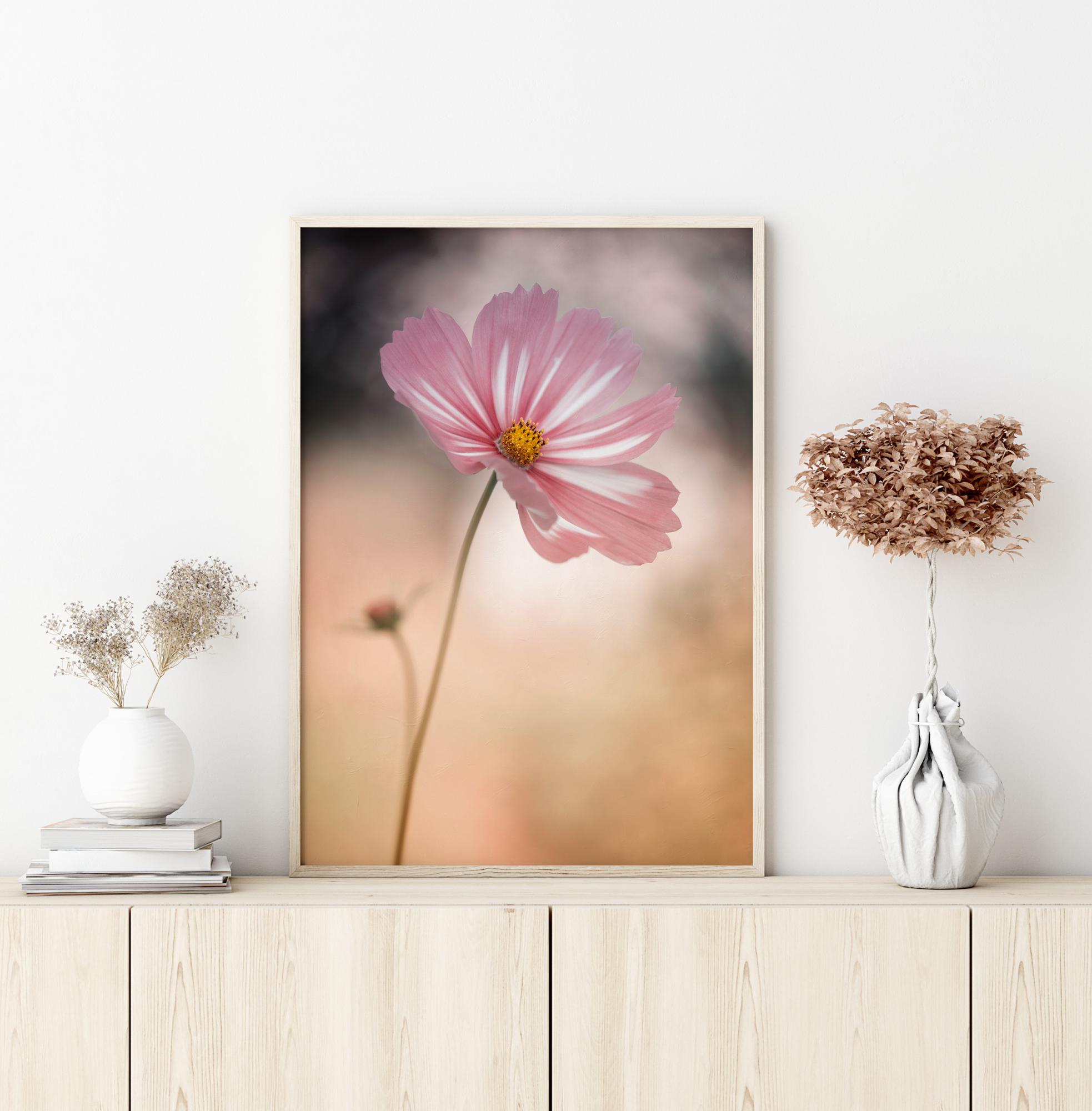 Fantastičan poster s kozmosovim cvijetom kroz čije latice svijetli svjetlost. Ružičasta boja latica i žuta sredina su svijetle uz breskvastu pozadinu koja daje dubinu. Osjetite svjetlo i svježinu dok gledate ovu nježnu pastelnu sliku koja visi u vašem domu.