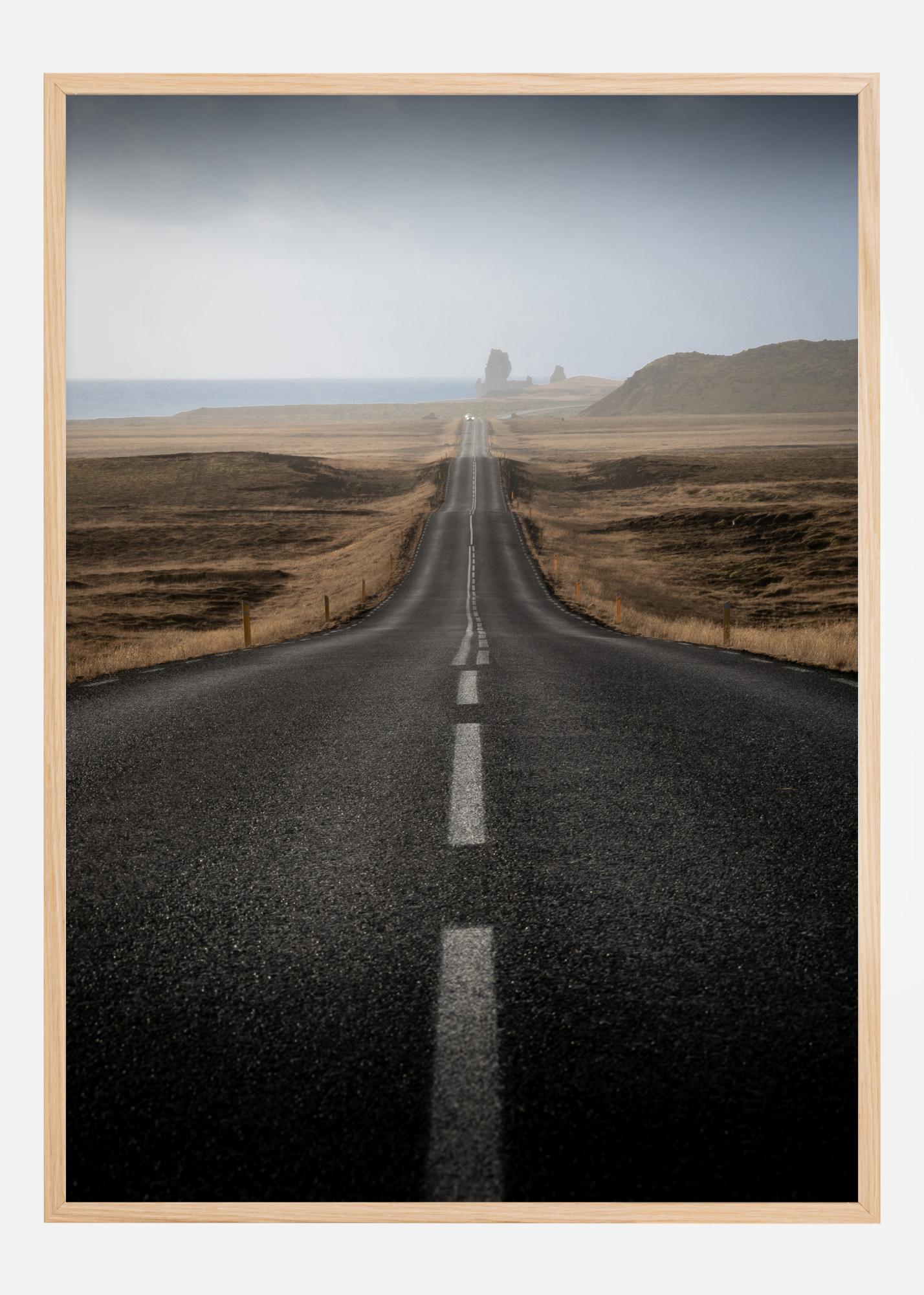 Plakat krajolika s cestom koja prolazi duž udaljenog sela. Asfaltirana cesta nestaje u daljini i bijele linije označavaju put. Uz obje strane nalaze se smeđa polja, a vidiš more i brežuljke u daljini. Pusti mašti na volju o tome kamo te put može odvesti kad ova slika visi na zidu.