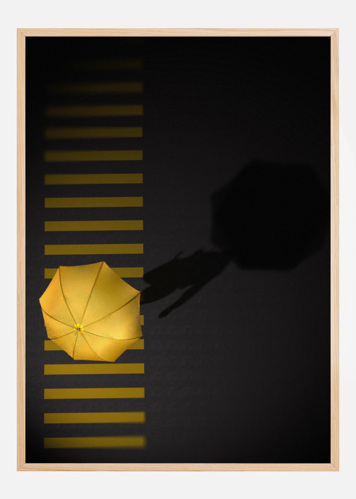 Zračna fotografija pješaka s žutim kišobranom na pješačkom prijelazu. Svijetložute linije pješačkog prijelaza dijele se jarkim žutim kišobranom. Sjena pješaka dodaje dodatnu dramu slici i čini djelo savršenim detaljem za uređenje interijera.