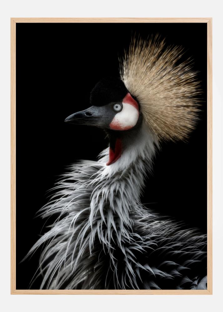 Fantastičan poster divljine s ždralom na crnoj pozadini. Bijelo perje i pahuljasta žuta kruna dramatično se ističu i stvaraju kraljevski efekt. Crveni i bijeli uzorci usmjeravaju pogled na ptičje oko. Divite se koliko je priroda veličanstvena uz pomoć ovog fantastičnog portreta ptice.