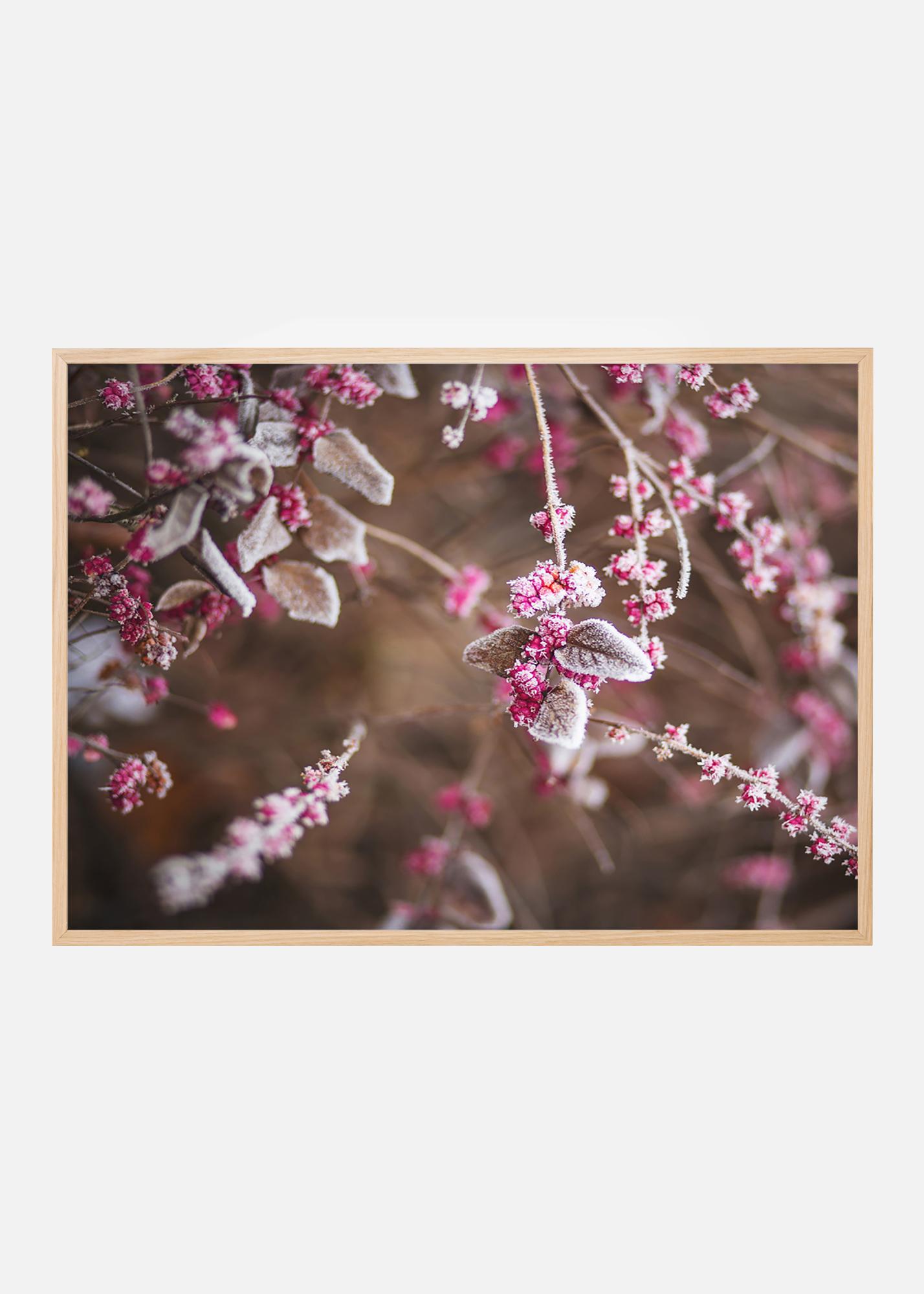 Fotografija s detaljima smrznutih ružičastih bobica s plitkim dubinskim poljem. Tisak s bobicama u ružičastoj boji i pozadinom u čokoladnim tonovima pruža topao i ugodan osjećaj. U većoj veličini s lijepim okvirom slika postaje središnja točka u dnevnoj sobi, ili postavite manju varijantu u kolaž s drugim posterima u istim nijansama boja.