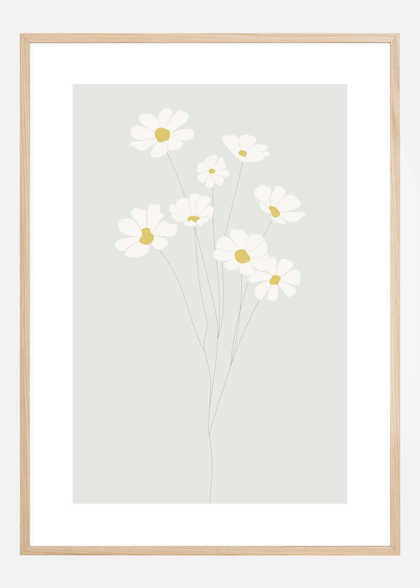 Suptilni poster s otiskom tratinčice s osjetljivim izgledom. Jednostavni bijeli i žuti cvjetovi protežu se prema gore na tankim stabljikama prema mekoj blijedo plavoj pozadini. Objesite ovu sliku u spavaćoj sobi vašeg djeteta za smirujuću, ali slatku atmosferu.