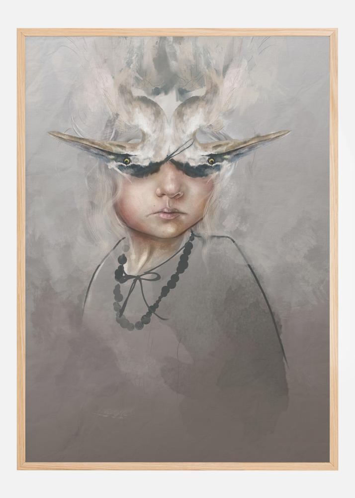 Jezivi poster s osobom obavijenom dimom. Glava je pokrivena šeširom, koji izgleda kao da gori i izgleda kao dvije preokrenute ptice ili lubanja. Oči su mistično zasjenjene, a osoba zrači tajanstvenim mirom. Objesite ovo djelo u svoju kuću i dopustite daljnja tumačenja.