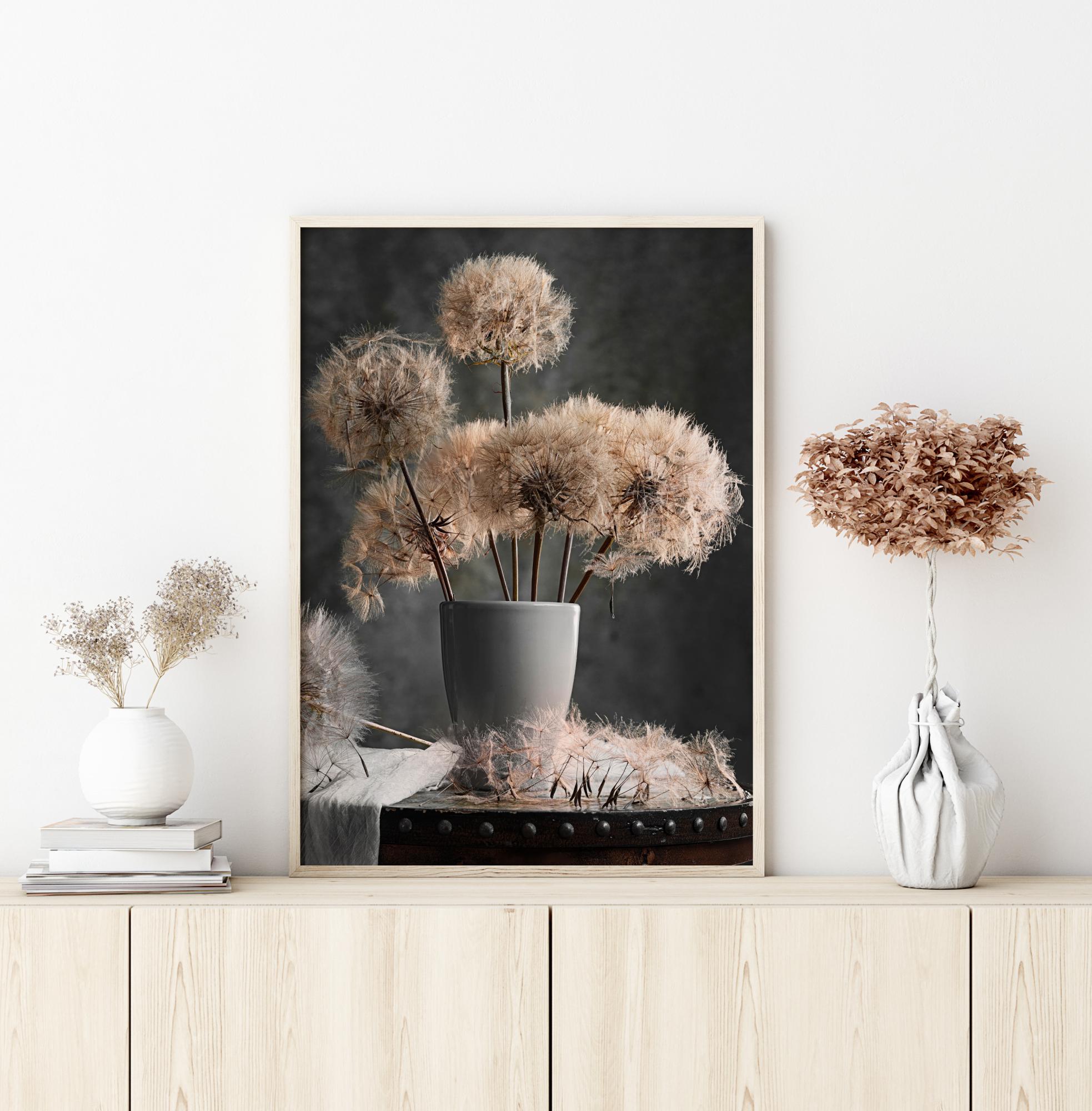 Stilleben poster s ocvalom maslačkom u vazi na tamno sivoj pozadini. Sjemenke maslačka počele su ispadati i lepršati oko glavica cvijeća. Zamislite protok vremena dok gledate ove ocvale maslačke.