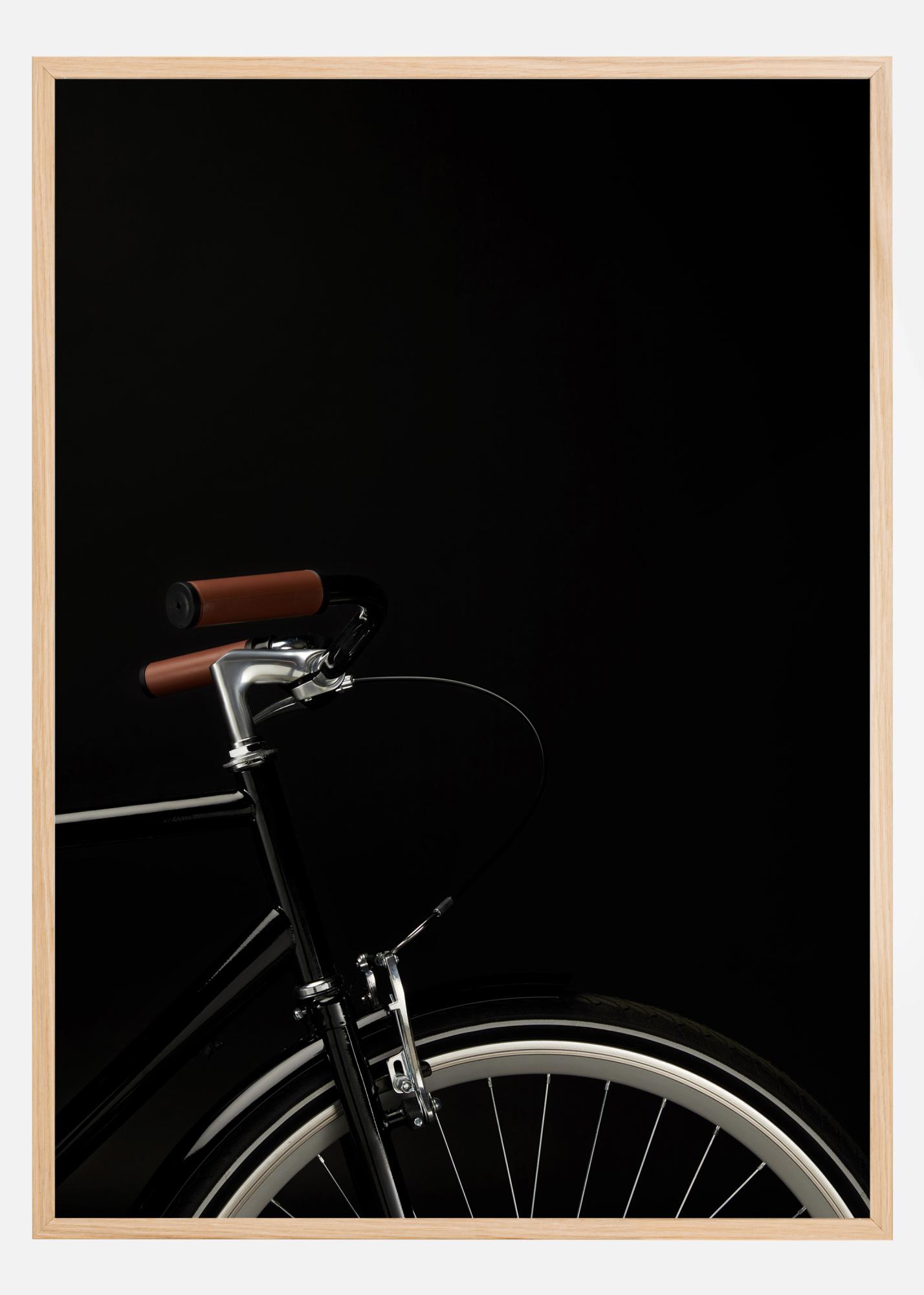 Dramatičan poster s gornjom polovinom bicikla na čvrstoj crnoj pozadini. Smeđe ručke upravljača, sjajni kromirani okvir i bijela guma snažno se ističu protiv crnog. Za ljubitelja bicikla, ova slika je neizbježna.