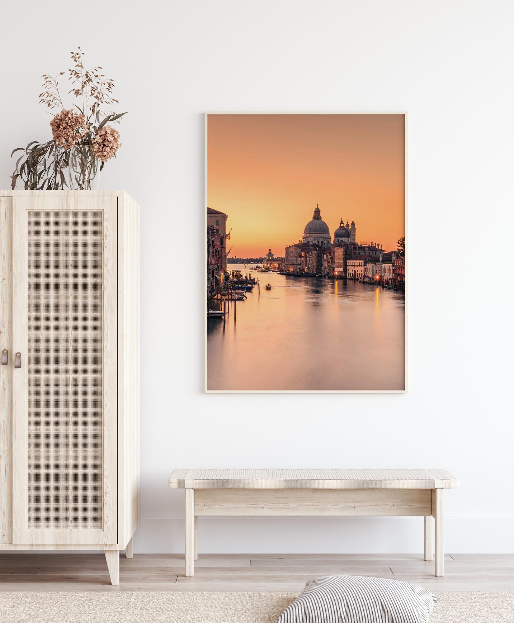 Plakat grada s Venecijom u zoru. Široki kanal otvara se prema moru s gradom duž svake strane. Nebo je prekrasne narančaste boje dok sunce izlazi iznad katedrale. Osjetite toplinu novog dana uz pomoć ove prekrasne i mirne slike.