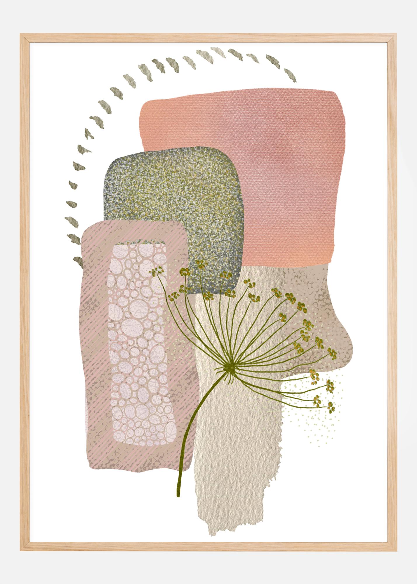 Ovaj poster pruža osjećaj mira i ljepote kroz svoju opuštenu kombinaciju nježnih tonova i apstraktnih oblika. U središtu kompozicije nalazi se delikatna cvjetna stabljika koja se proteže prema gore, sa svojim malim zelenim pupoljcima koje osvjetljava tanka, graciozna stabljika. Preklapanje tekstura i boja stvara dubinu i zanimljivost koja uhvati oko i poziva na dulje promatranje. Sa svojom umirujućom ružičastom i zelenom paletom, ovaj umjetnički print prenosi osjećaj prirodne tišine i jednostavnosti, čineći ga prekrasnim dodatkom svakom domu.