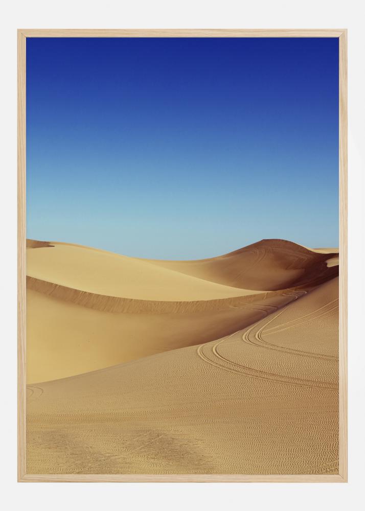 Živopisan plakat s prekrasnim žutim pješčanim dinama s dvije tragove guma u zavoju. Svijetle pješčane dine pojačane su uzbudljivom plavošću neba. Izgubite se u velikom prostranstvu s ovim fantastičnim djelom na vašem zidu.