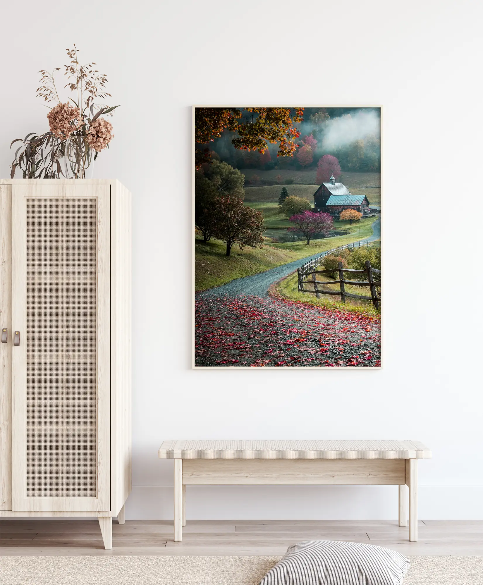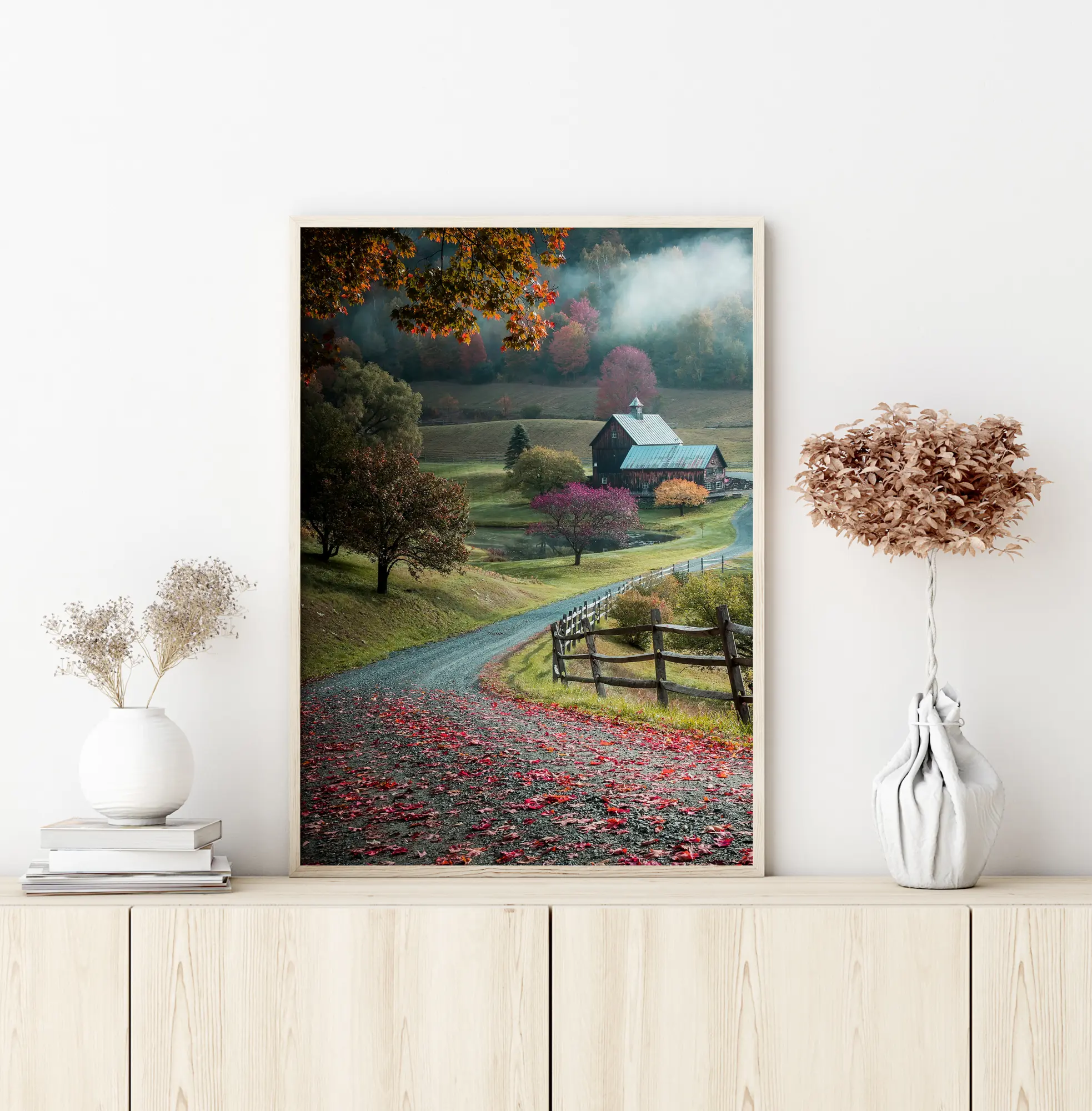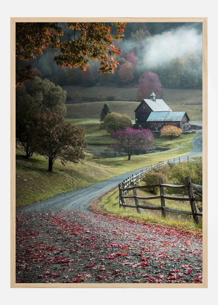 Prirodni poster s ruralnim krajolikom malom cestom, idiličnom farmom i jesenjim drvećem. Crveno lišće leži na cesti koja vodi u dolinu i malu kuću. Sunčeva zraka probija se u dolinu i osvjetljava jesensko lišće na drvetu. Osjetite čar seoskog krajolika kad objesite ovu sliku kod kuće.