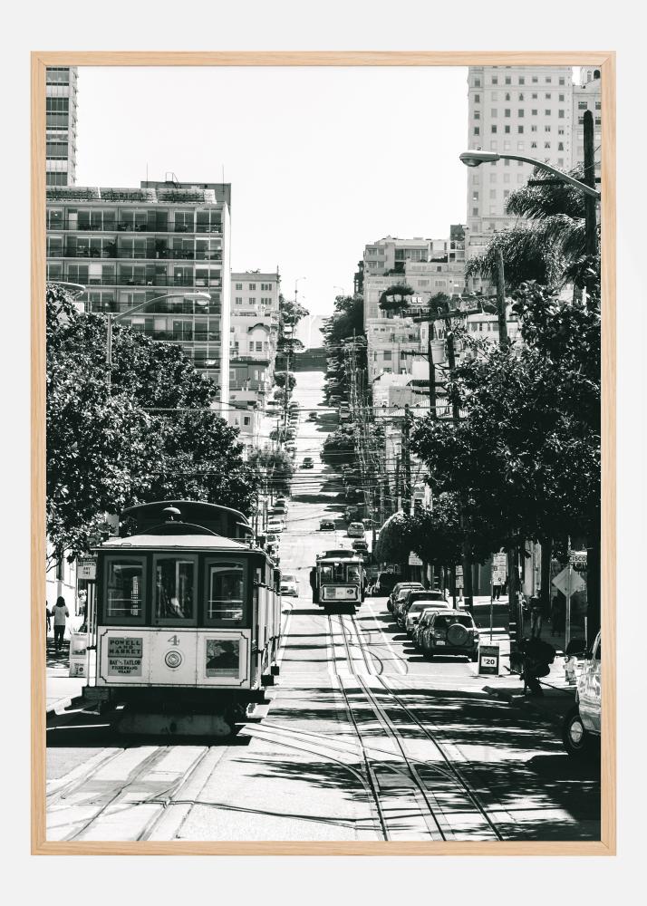 Poster s gradskim prizorom središta San Francisca. Tramvaj se penje uzbrdo između kuća u prvom planu s drvećem sa svake strane. Ovaj crno-bijeli ispis dodaje dašak klase bez obzira na koji zid odlučite objesiti ga.