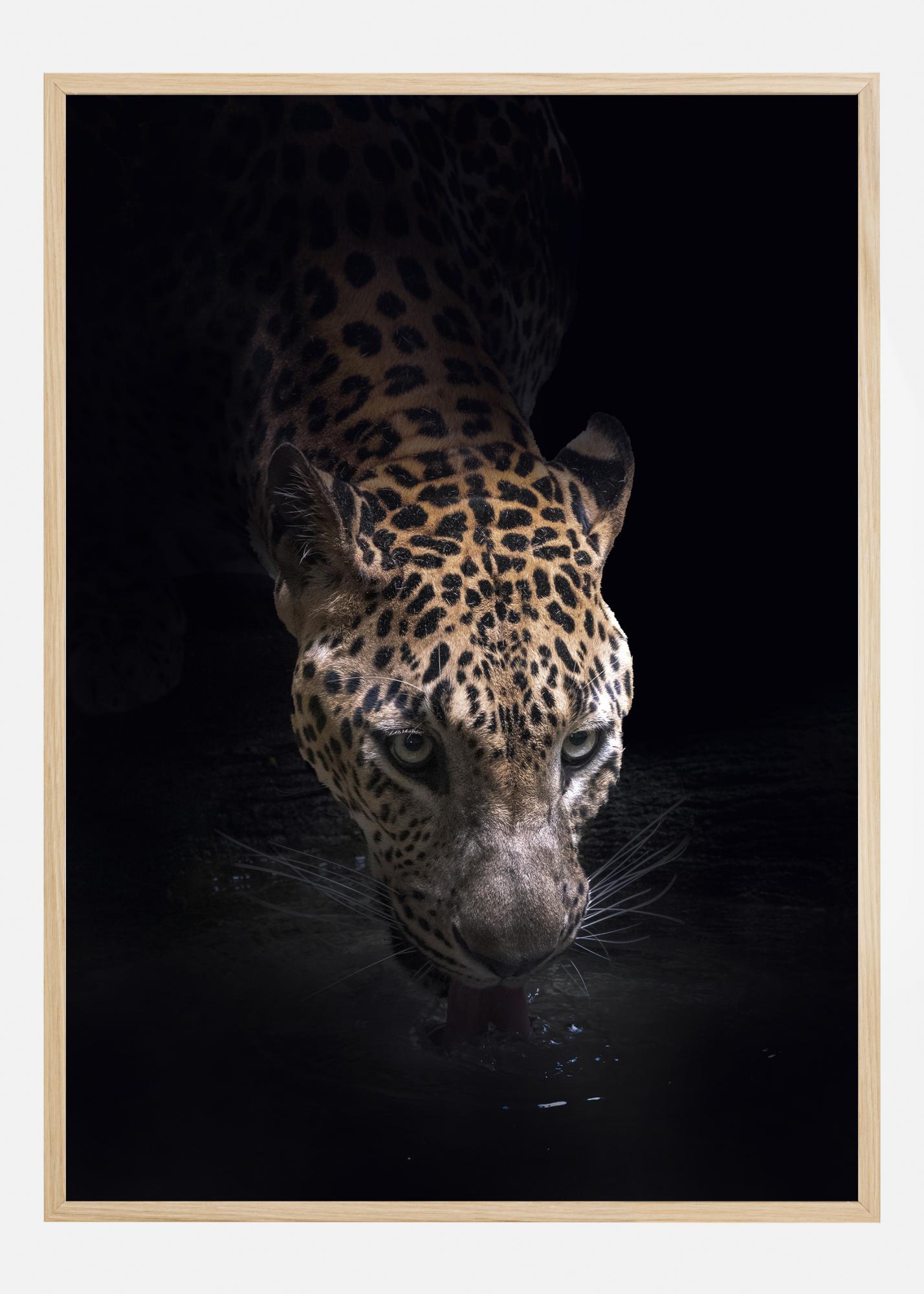 Ovaj dramatični poster hvata leoparda u intimnom trenutku dok tiho pije vodu, snažan trenutak divlje prirode uhvaćen u vremenu. Crna pozadina ističe zlatnu boju veličanstvenog krzna i prepoznatljive mrlje, stvarajući gotovo trodimenzionalni efekt. Leopard je okrenut prema promatraču s pogledom ispunjenim koncentracijom i prisutnošću divlje životinje, što stvara trenutnu povezanost između životinje i čovjeka.