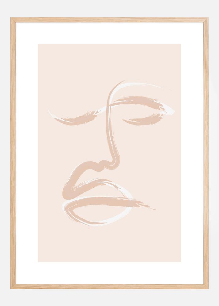 Apstraktni portretni poster s odvažnim ružičastim potezima kistom koji stvaraju lice. Jedan potez kista vijuga preko stranice stvarajući nos i usta. Oči su napravljene na način da izgleda gotovo kao da namiguju. Bijeli okvir omogućava da se ovaj istakne na pastelno obojenom zidu.