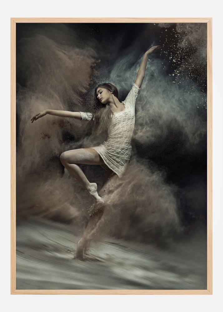 Dinamičan poster s fantastičnom baletnom plesačicom, usred pokreta. Sportska djevojka je odjevena u bijelo i lijepo se okreće kako bi stvorila pokret na slici. U pozadini se nalaze meki oblaci sepije i pastelnih boja koji stvaraju nježan dojam. Izgubite se u magiji ove elegantne slike.