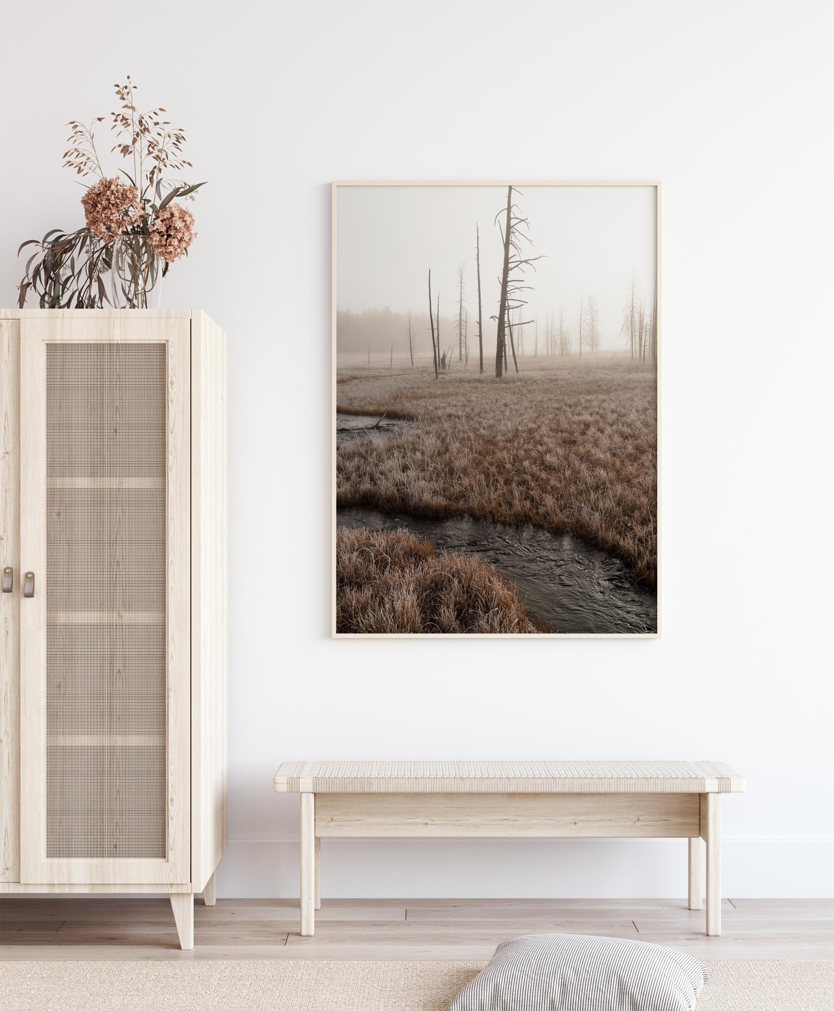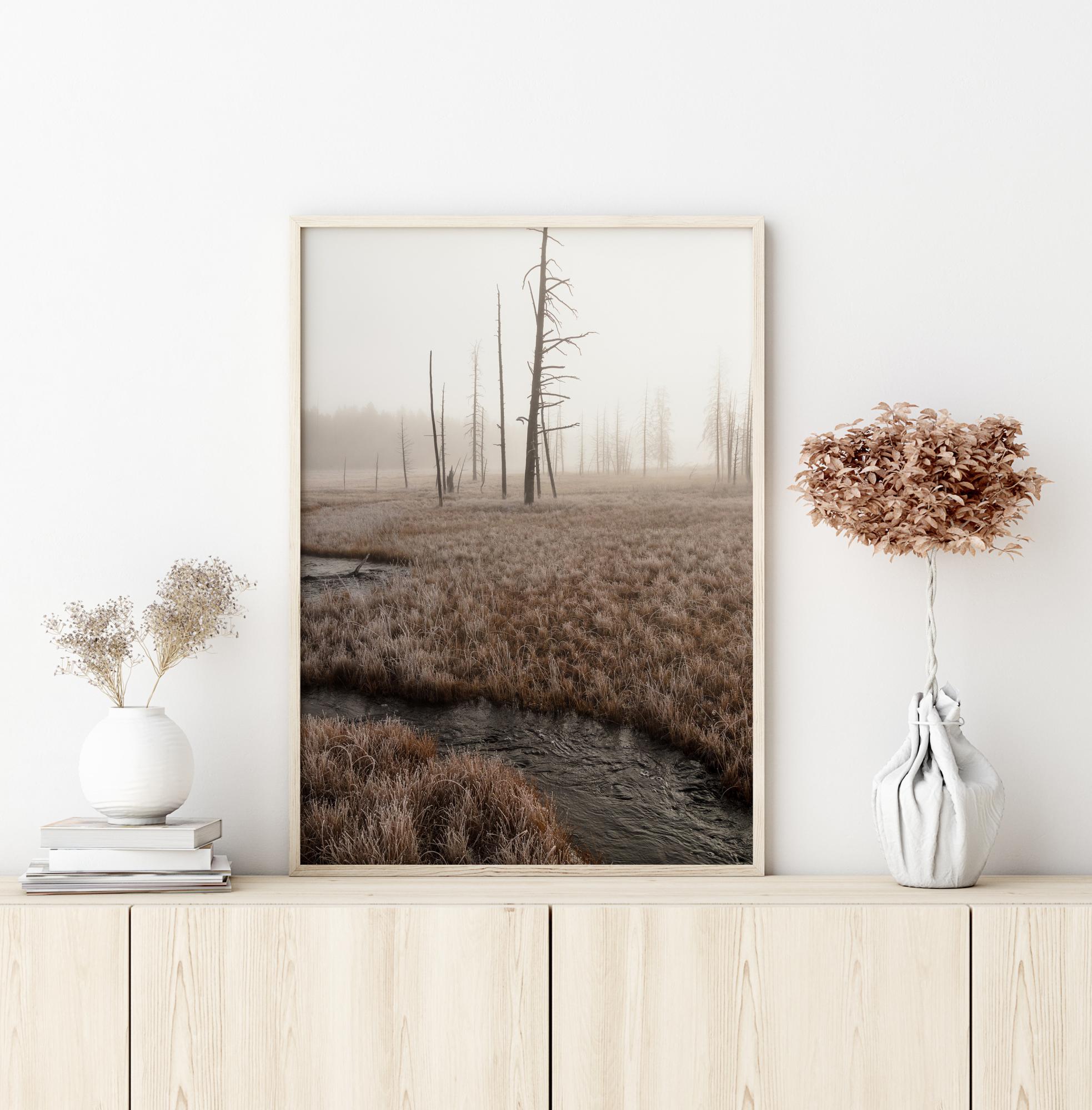 Jedna nadnaravna pejzažna poster s ravnicom mrtvih stabala i rijekom koja teče kroz nju. Na ovoj ranoj jutarnjoj fotografiji magla obavija stabla i žutu travu. Pratite rijeku dok vijuga kroz krajolik prema udaljenoj šumi. Izgubite se u drugom vremenu i mjestu dok postavljate ovu sliku.