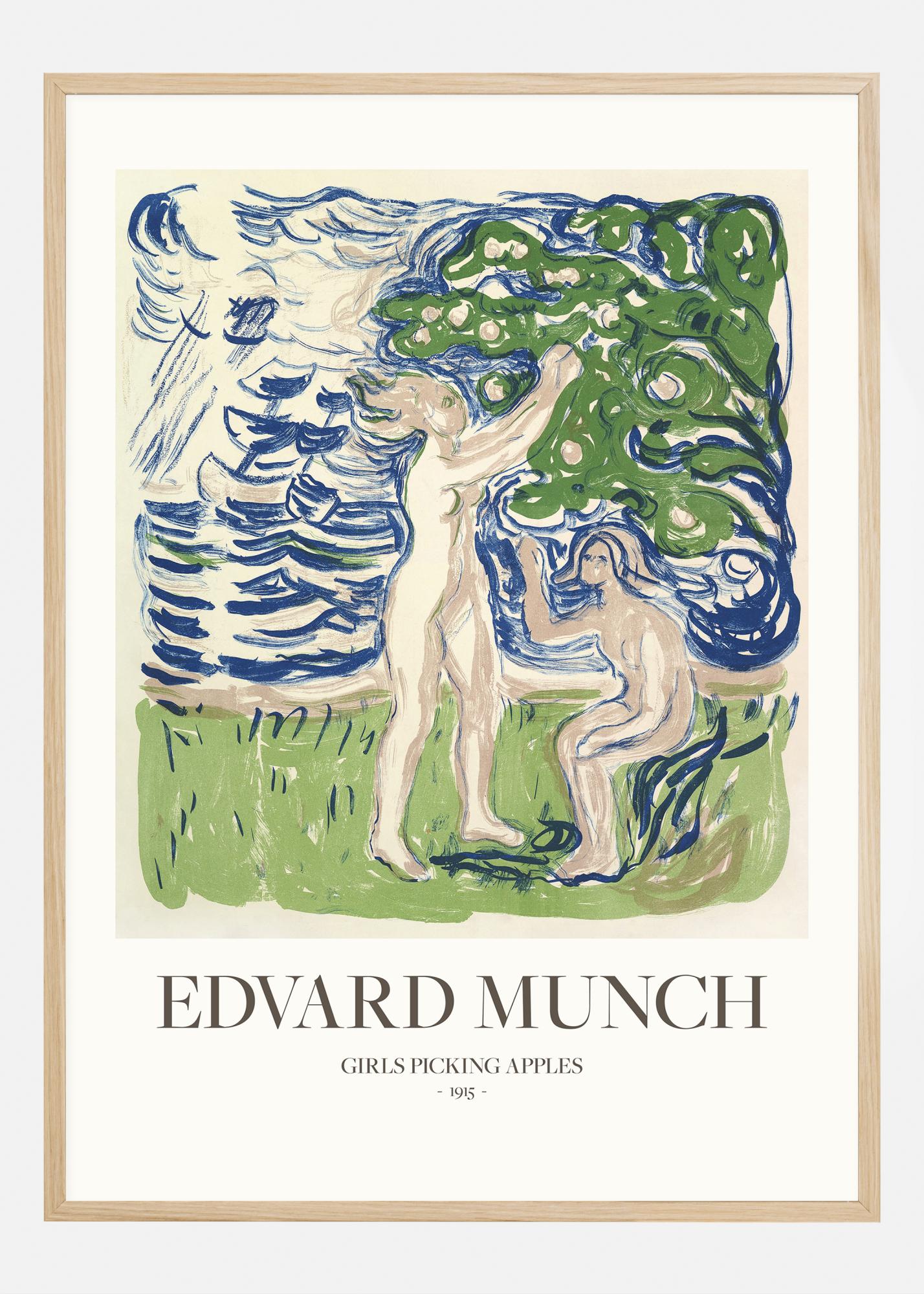 Ovaj poster prikazuje 'Girls Picking Apples', djelo iz 1915. Edvarda Muncha, koje hvata idiličnu i atmosfersku scenu. Umjetničko djelo daje jednostavnu, ali izražajnu prikaz dvije figure među stablima, čija su tijela i lica naglašena slobodnim, opuštenim potezima kistom. Shema boja dominira svježim zelenilom i zemljanim smeđim tonovima koji stvaraju travnjak i debla stabala, dok plavo i bijelo nebo pruža živopisnu pozadinu koja naglašava jasne zelene tonove jabuka i nježne tonove kože. Ovaj print je posveta jednostavnim užicima u životu i savršen umjetnički dodir koji bilo kojem prostoru donosi osjećaj prirode i slobode.