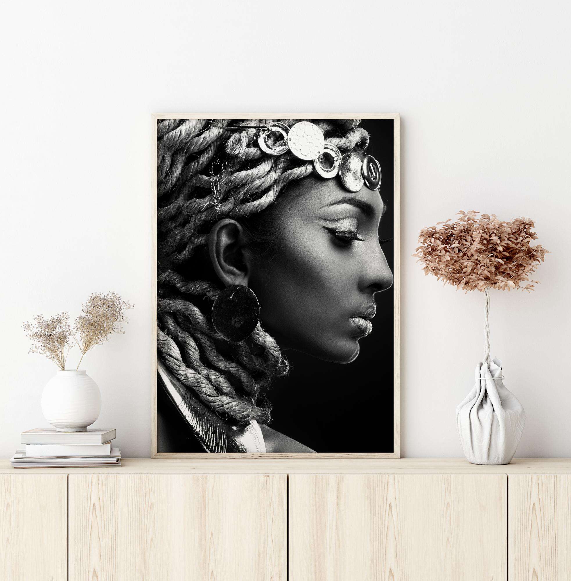 Fantastičan portret s prikazom profila žene obučene u drevnom egipatskom stilu. Ova crno-bijela slika stvara osjećaj drame jer ova prekrasna žena arogantno gleda dolje. Njezina glava, uši i vrat prekriveni su velikim zlatnim nakitom, simbolom bogatstva. Neka vas svaki dan inspirira ova snažna žena.
