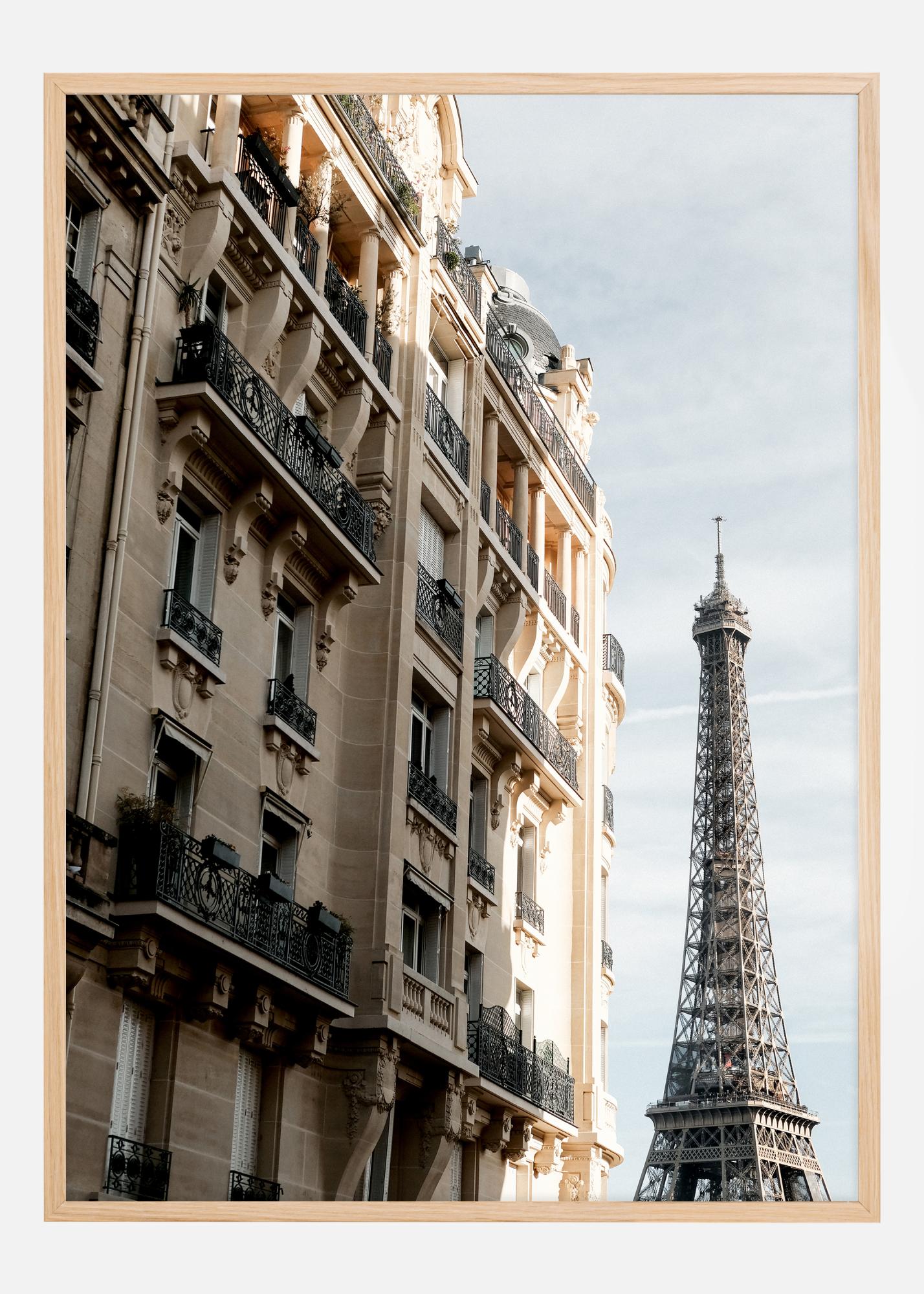Ovaj poster prikazuje klasičan pogled na Pariz gdje se Eiffelov toranj ponosno uzdiže iza tipičnih gradskih stambenih zgrada s njihovim balkonima od kovanog željeza i skulpturalnim fasadnim detaljima. To je scena koja odiše pariškom atmosferom i elegancijom, savršena za dodavanje francuskog šarma bilo kojem domu. Slika hvata savršenu ravnotežu između arhitektonskih dragulja grada i otvorenog nebeskog prostora, pružajući osjećaj prostora i slobode koji je sinonim za parišku dušu.