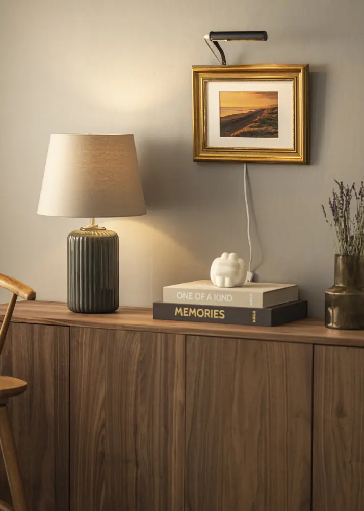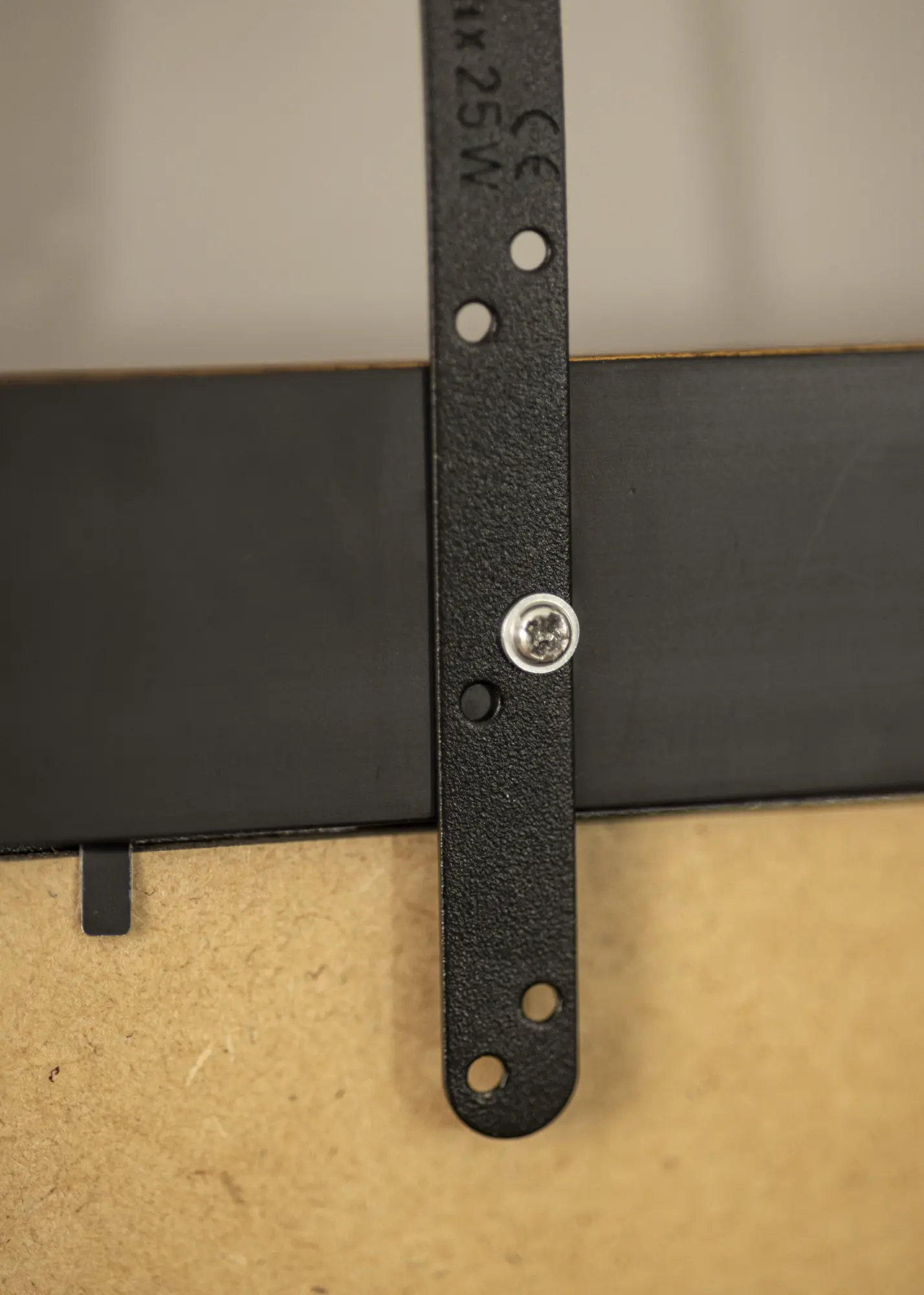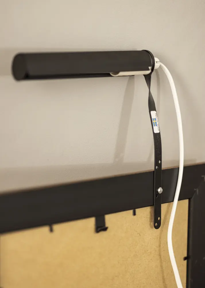 Obično pričvrstite rasvjetu za slike na stražnjoj strani okvira, mana toga je što je potreban drveni okvir (neki kompozitni okviri također odgovaraju) koji ima širok profil kako bi bilo moguće uvrstiti u okvir. S našim zidnim nosačem ne morate o tome razmišljati, već jednostavno montirate svoju rasvjetu za slike direktno na zid iza slike.