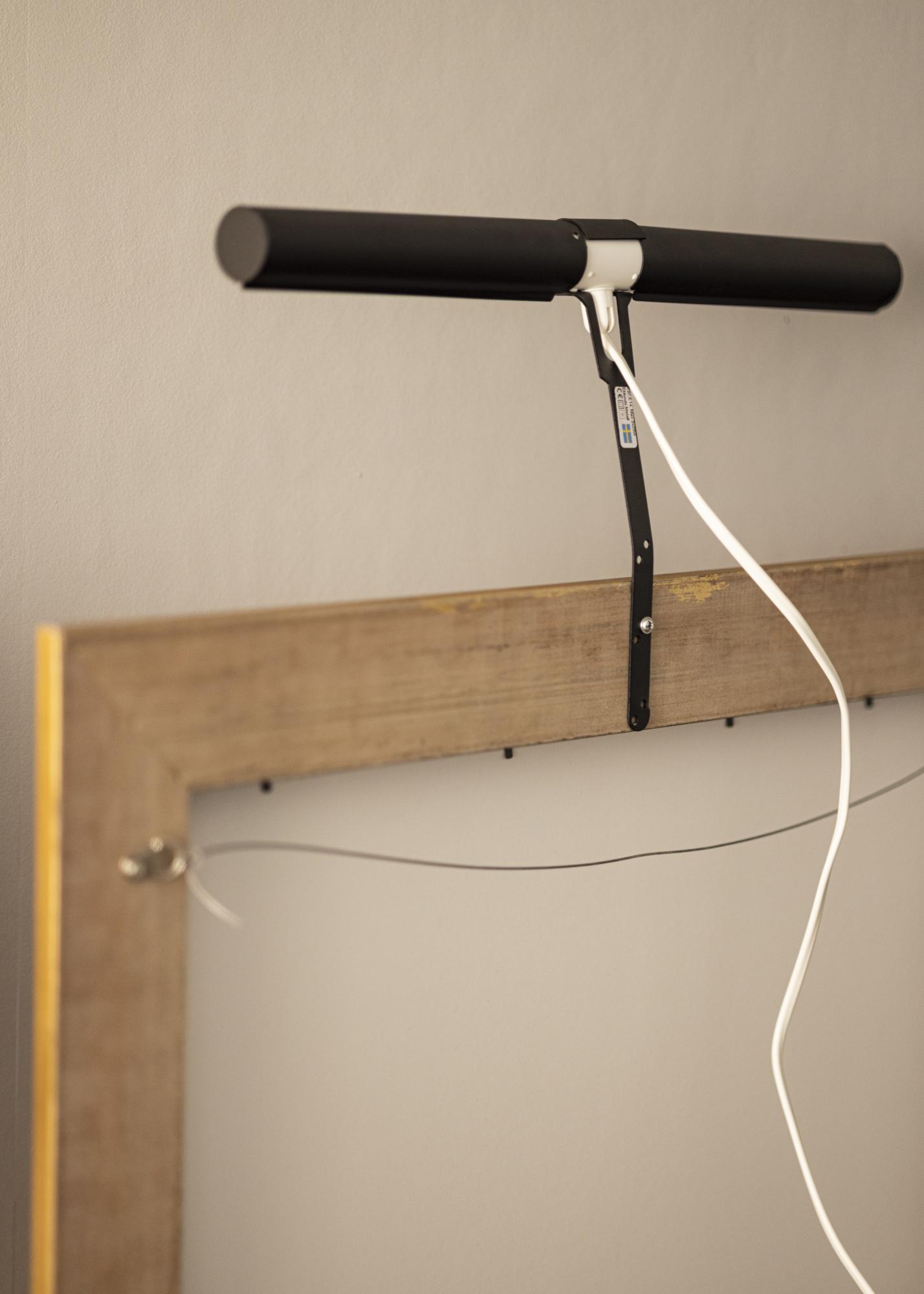 Obično pričvršćujete rasvjetu za slike na stražnju stranu okvira, nedostatak toga je što je potreban drveni okvir (neki kompozitni okviri također su prikladni) koji ima široki profil kako bi bilo moguće zavrnuti u okvir. S našim zidnim nosačem to vam nije potrebno, već jednostavno montirate svoju rasvjetu za slike izravno na zid iza slike.