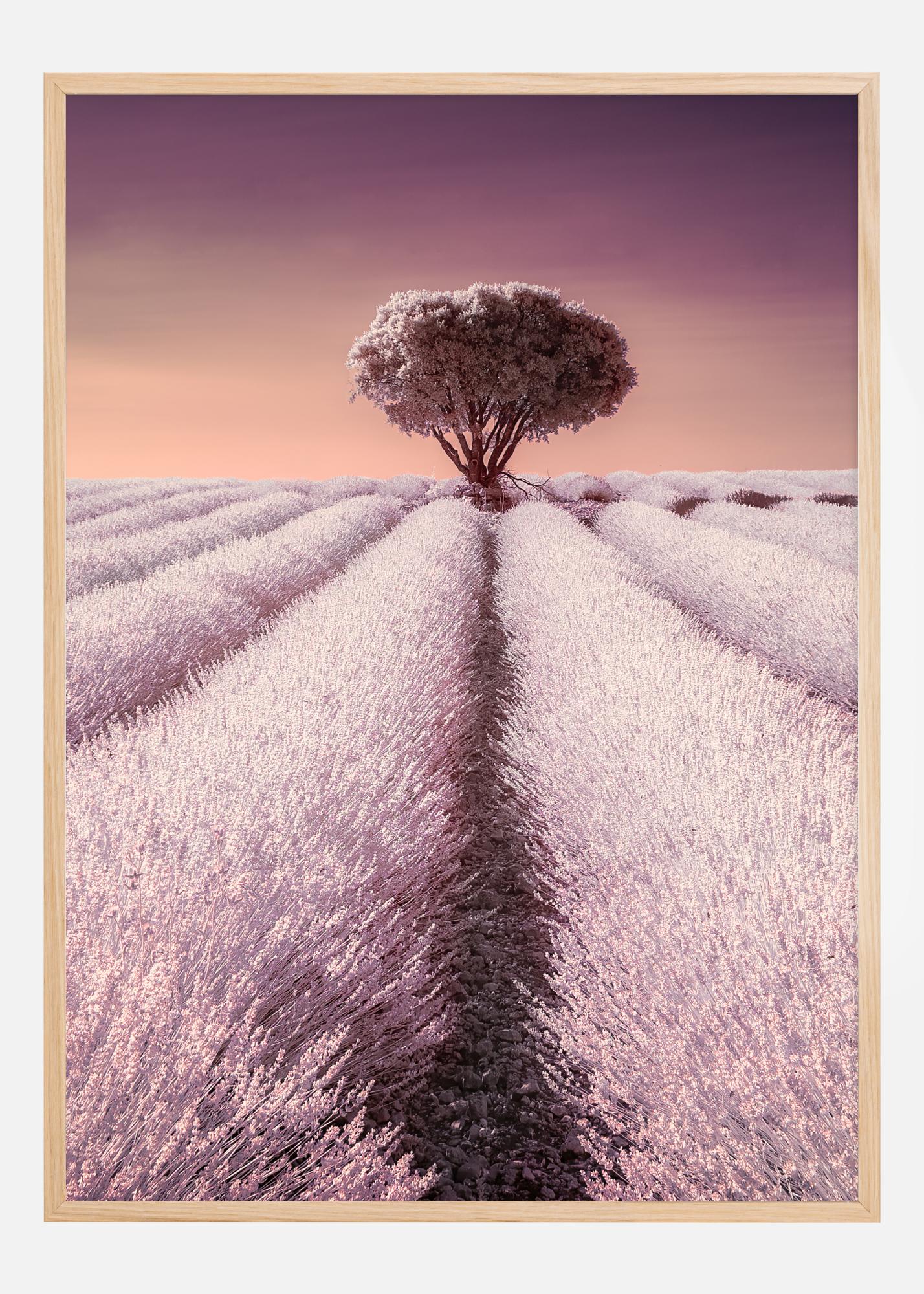 Zakoračite u svijet snova boje i fantazije s našim ekskluzivnim posterom. Ovaj print odiše čarobnim osjećajem sa svojim pastelno obojenim nebom koje prelazi iz toplih ružičastih u umirujuće ljubičaste nijanse. Motiv ističe usamljeno drvo, veličanstveno centrirano uz čistu liniju staze polja lavande. Ovaj plakat je vizualna gozba za oči i savršeno bi odgovarao kao središnji prikaz u svakoj prostoriji, dodajući dašak mira i ljepote.