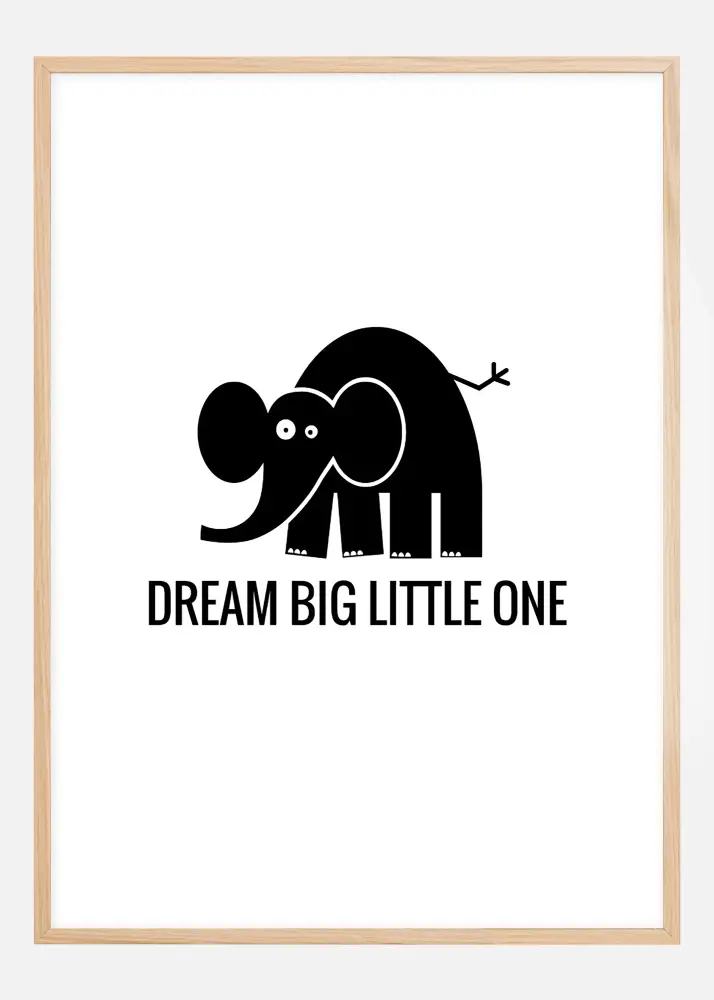 Moderna crno-bijela poster za dječju sobu s veselim slonom koji potiče dijete da sanja veliko u životu. Motiv je grafički i elegantan, što ga čini prikladnim za svaku dječju sobu. Plakat je odličan kao samostalna slika iznad kreveta ili u kombinaciji s drugim tiskovinama na dužem zidu i može se uspješno kombinirati s posterom Dino Favorite, Zec Happy, Pas Little, Superhero ili Pingvin Cool.