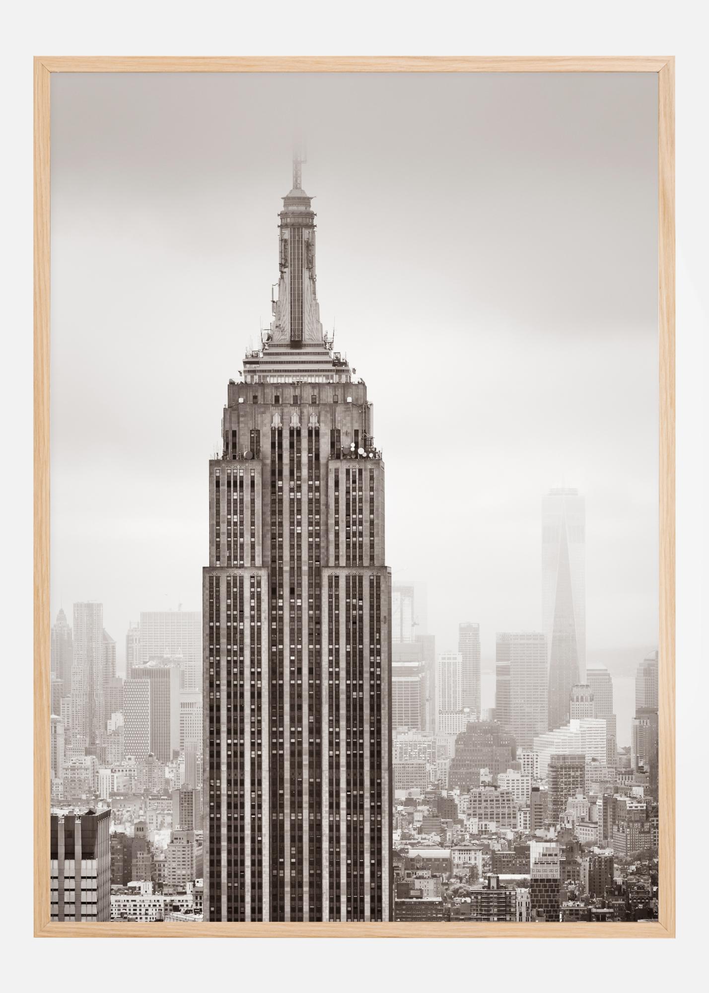 Urban plakat s Empire State Building u New Yorku. Empire State Building je fokus ovdje, gdje stoji s New Yorkom u pozadini. Ostatak grada djelomično je skriven u magli, što čini da se detalji na ovom neboderu jasno ističu. Zamislite da je ovo vaš pogled kada ga objesite u svom domu.
