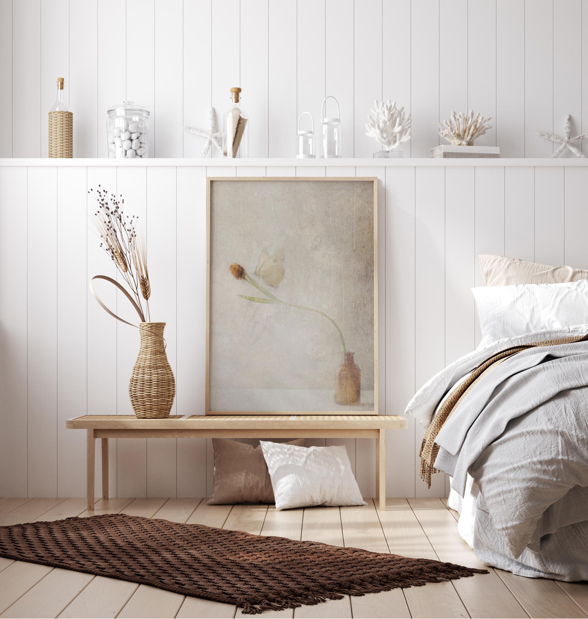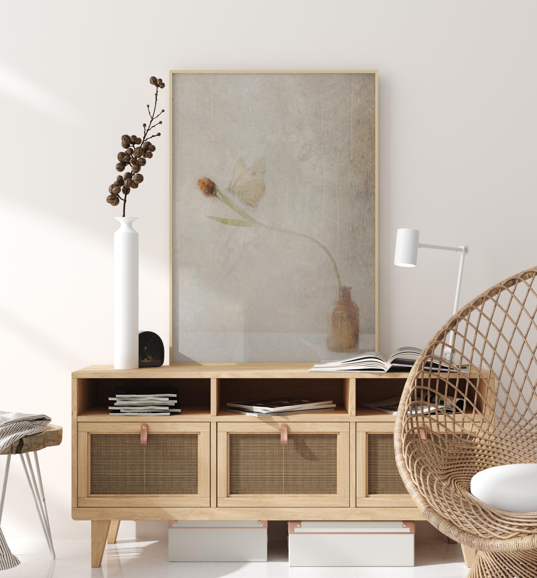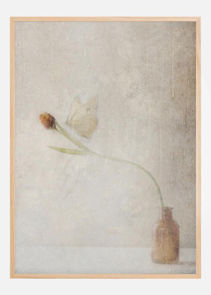 Diskretni poster s leptirem koji slijeće na cvijet. Ova suptilna slika s tonovima smeđe boje daje toplinu prostoriji. Leptir nježno slijeće na cvijet koji se savija prema sredini slike. Krila gotovo da se stapaju sa zidom iza u ovom kratkotrajnom susretu.