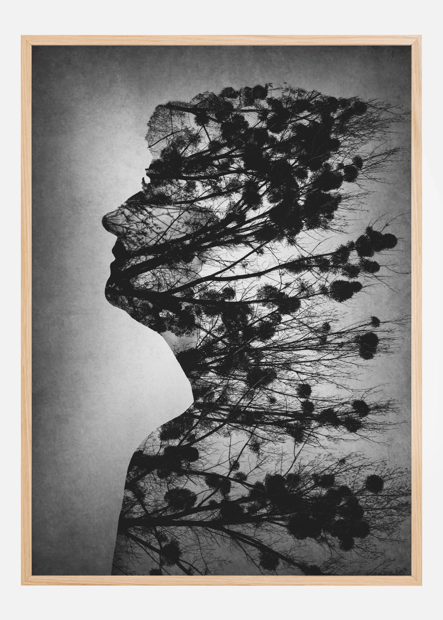 Apstraktni poster s licem žene, stvoren korištenjem različitih listova i grana. U fantastičnom crno-bijelom, ova dramatična poza čini da izgleda kao da je vjetar puhnuo te listove preko njenog lica. Snažno pozadinsko svjetlo ističe profil koji daje ovaj snažan, ali proziran osjećaj.