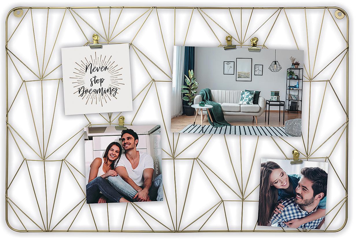 Kolaž okvir dizajniran kao oglasna ploča gdje učvrstite svoje fotografije s kopčama. Okvir je izrađen od metala i dolazi u zlatnoj nijansi. Budući da sami postavljate svoje slike, možete odabrati miješati fotografije različitih veličina i također pokazati svoju kreativnost pričvršćivanjem, na primjer, manjih postera ili lijepih papirića! Okvir mjeri 62x41 cm u vanjskim dimenzijama. Ovaj okvir odgovara izvrsno iznad radnog stola, u kuhinji ili na nekom drugom mjestu gdje dolazi do izražaja njegova dekorativna i funkcionalna strana. Zidni nosač je uključen.