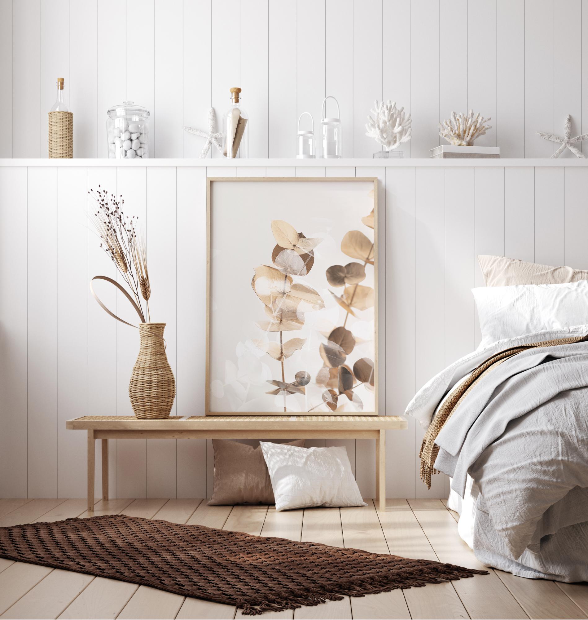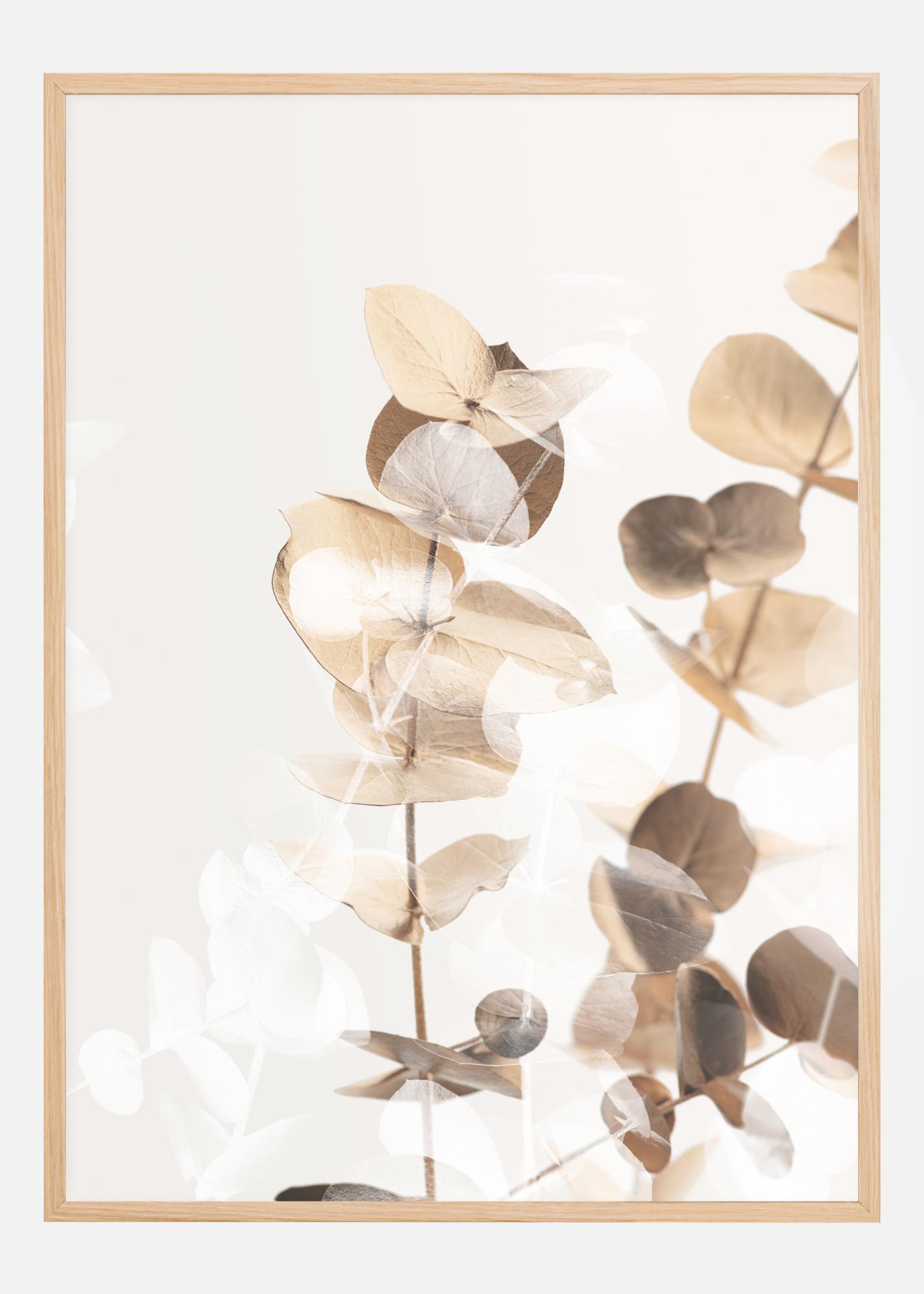 Zlatni poster s listovima i granama eukaliptusa. Zlaćani i smeđi listovi ističu se blistavim oblikom naspram jednostavne bijele pozadine. Kako biste istaknuli ovo lišće, uskladite sličan zlatni ili tamni krem zid za dodatnu eleganciju.